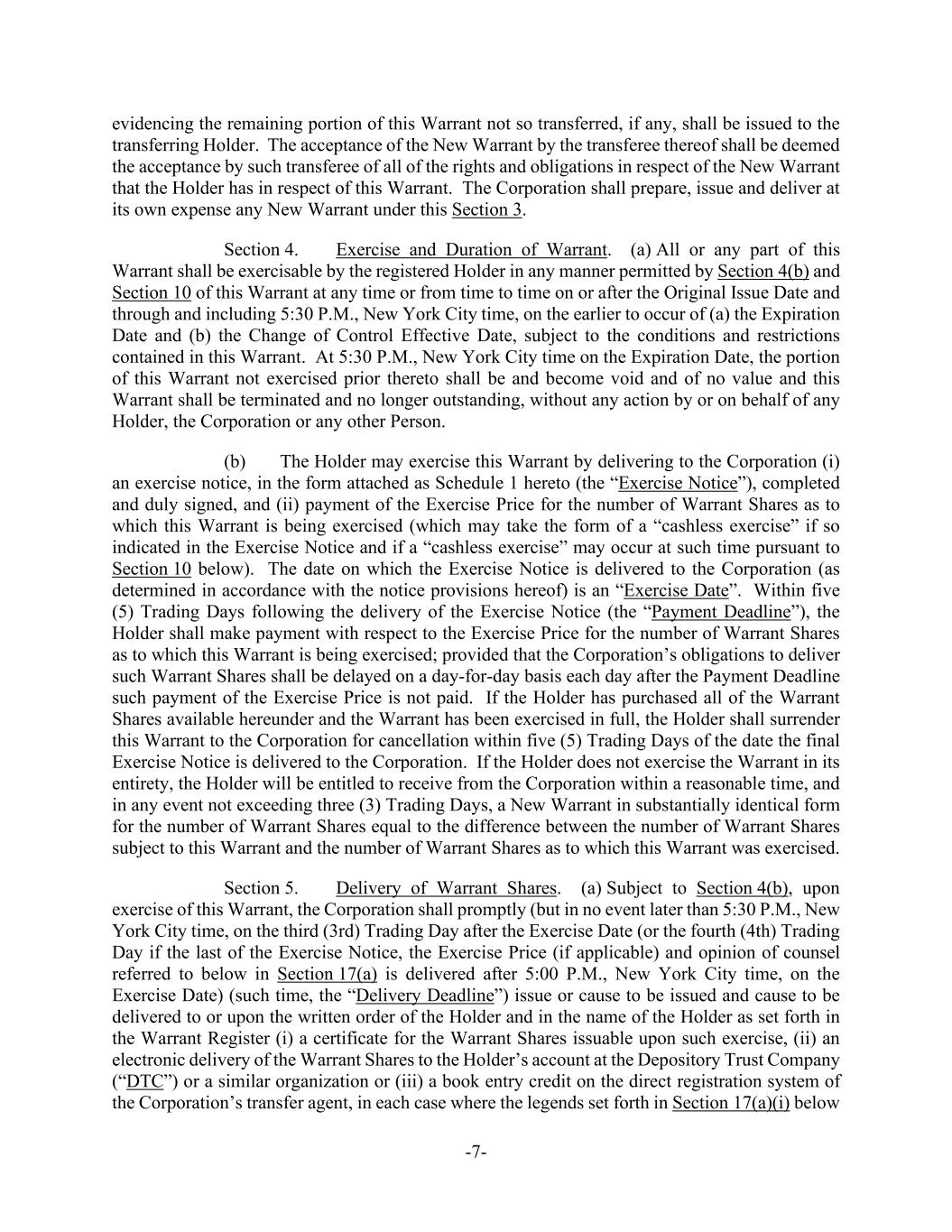 -7- evidencing the remaining portion of this Warrant not so transferred, if any, shall be issued to the transferring Holder. The acceptance of the New Warrant by the transferee thereof shall be deemed the acceptance by such transferee of all of the rights and obligations in respect of the New Warrant that the Holder has in respect of this Warrant. The Corporation shall prepare, issue and deliver at its own expense any New Warrant under this Section 3. Section 4. Exercise and Duration of Warrant. (a) All or any part of this Warrant shall be exercisable by the registered Holder in any manner permitted by Section 4(b) and Section 10 of this Warrant at any time or from time to time on or after the Original Issue Date and through and including 5:30 P.M., New York City time, on the earlier to occur of (a) the Expiration Date and (b) the Change of Control Effective Date, subject to the conditions and restrictions contained in this Warrant. At 5:30 P.M., New York City time on the Expiration Date, the portion of this Warrant not exercised prior thereto shall be and become void and of no value and this Warrant shall be terminated and no longer outstanding, without any action by or on behalf of any Holder, the Corporation or any other Person. (b) The Holder may exercise this Warrant by delivering to the Corporation (i) an exercise notice, in the form attached as Schedule 1 hereto (the “Exercise Notice”), completed and duly signed, and (ii) payment of the Exercise Price for the number of Warrant Shares as to which this Warrant is being exercised (which may take the form of a “cashless exercise” if so indicated in the Exercise Notice and if a “cashless exercise” may occur at such time pursuant to Section 10 below). The date on which the Exercise Notice is delivered to the Corporation (as determined in accordance with the notice provisions hereof) is an “Exercise Date”. Within five (5) Trading Days following the delivery of the Exercise Notice (the “Payment Deadline”), the Holder shall make payment with respect to the Exercise Price for the number of Warrant Shares as to which this Warrant is being exercised; provided that the Corporation’s obligations to deliver such Warrant Shares shall be delayed on a day-for-day basis each day after the Payment Deadline such payment of the Exercise Price is not paid. If the Holder has purchased all of the Warrant Shares available hereunder and the Warrant has been exercised in full, the Holder shall surrender this Warrant to the Corporation for cancellation within five (5) Trading Days of the date the final Exercise Notice is delivered to the Corporation. If the Holder does not exercise the Warrant in its entirety, the Holder will be entitled to receive from the Corporation within a reasonable time, and in any event not exceeding three (3) Trading Days, a New Warrant in substantially identical form for the number of Warrant Shares equal to the difference between the number of Warrant Shares subject to this Warrant and the number of Warrant Shares as to which this Warrant was exercised. Section 5. Delivery of Warrant Shares. (a) Subject to Section 4(b), upon exercise of this Warrant, the Corporation shall promptly (but in no event later than 5:30 P.M., New York City time, on the third (3rd) Trading Day after the Exercise Date (or the fourth (4th) Trading Day if the last of the Exercise Notice, the Exercise Price (if applicable) and opinion of counsel referred to below in Section 17(a) is delivered after 5:00 P.M., New York City time, on the Exercise Date) (such time, the “Delivery Deadline”) issue or cause to be issued and cause to be delivered to or upon the written order of the Holder and in the name of the Holder as set forth in the Warrant Register (i) a certificate for the Warrant Shares issuable upon such exercise, (ii) an electronic delivery of the Warrant Shares to the Holder’s account at the Depository Trust Company (“DTC”) or a similar organization or (iii) a book entry credit on the direct registration system of the Corporation’s transfer agent, in each case where the legends set forth in Section 17(a)(i) below