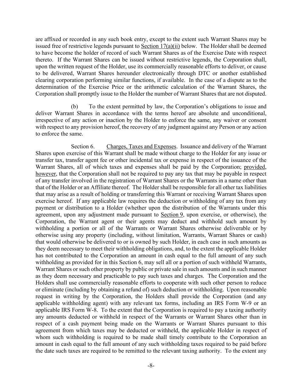 -8- are affixed or recorded in any such book entry, except to the extent such Warrant Shares may be issued free of restrictive legends pursuant to Section 17(a)(ii) below. The Holder shall be deemed to have become the holder of record of such Warrant Shares as of the Exercise Date with respect thereto. If the Warrant Shares can be issued without restrictive legends, the Corporation shall, upon the written request of the Holder, use its commercially reasonable efforts to deliver, or cause to be delivered, Warrant Shares hereunder electronically through DTC or another established clearing corporation performing similar functions, if available. In the case of a dispute as to the determination of the Exercise Price or the arithmetic calculation of the Warrant Shares, the Corporation shall promptly issue to the Holder the number of Warrant Shares that are not disputed. (b) To the extent permitted by law, the Corporation’s obligations to issue and deliver Warrant Shares in accordance with the terms hereof are absolute and unconditional, irrespective of any action or inaction by the Holder to enforce the same, any waiver or consent with respect to any provision hereof, the recovery of any judgment against any Person or any action to enforce the same. Section 6. Charges, Taxes and Expenses. Issuance and delivery of the Warrant Shares upon exercise of this Warrant shall be made without charge to the Holder for any issue or transfer tax, transfer agent fee or other incidental tax or expense in respect of the issuance of the Warrant Shares, all of which taxes and expenses shall be paid by the Corporation; provided, however, that the Corporation shall not be required to pay any tax that may be payable in respect of any transfer involved in the registration of Warrant Shares or the Warrants in a name other than that of the Holder or an Affiliate thereof. The Holder shall be responsible for all other tax liabilities that may arise as a result of holding or transferring this Warrant or receiving Warrant Shares upon exercise hereof. If any applicable law requires the deduction or withholding of any tax from any payment or distribution to a Holder (whether upon the distribution of the Warrants under this agreement, upon any adjustment made pursuant to Section 9, upon exercise, or otherwise), the Corporation, the Warrant agent or their agents may deduct and withhold such amount by withholding a portion or all of the Warrants or Warrant Shares otherwise deliverable or by otherwise using any property (including, without limitation, Warrants, Warrant Shares or cash) that would otherwise be delivered to or is owned by such Holder, in each case in such amounts as they deem necessary to meet their withholding obligations, and, to the extent the applicable Holder has not contributed to the Corporation an amount in cash equal to the full amount of any such withholding as provided for in this Section 6, may sell all or a portion of such withheld Warrants, Warrant Shares or such other property by public or private sale in such amounts and in such manner as they deem necessary and practicable to pay such taxes and charges. The Corporation and the Holders shall use commercially reasonable efforts to cooperate with such other person to reduce or eliminate (including by obtaining a refund of) such deduction or withholding. Upon reasonable request in writing by the Corporation, the Holders shall provide the Corporation (and any applicable withholding agent) with any relevant tax forms, including an IRS Form W-9 or an applicable IRS Form W-8. To the extent that the Corporation is required to pay a taxing authority any amounts deducted or withheld in respect of the Warrants or Warrant Shares other than in respect of a cash payment being made on the Warrants or Warrant Shares pursuant to this agreement from which taxes may be deducted or withheld, the applicable Holder in respect of whom such withholding is required to be made shall timely contribute to the Corporation an amount in cash equal to the full amount of any such withholding taxes required to be paid before the date such taxes are required to be remitted to the relevant taxing authority. To the extent any