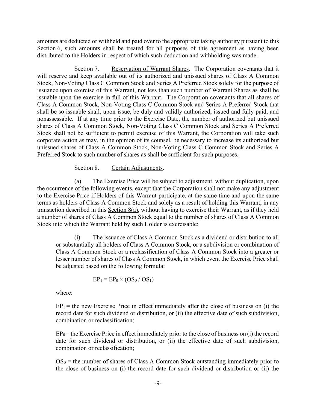 -9- amounts are deducted or withheld and paid over to the appropriate taxing authority pursuant to this Section 6, such amounts shall be treated for all purposes of this agreement as having been distributed to the Holders in respect of which such deduction and withholding was made. Section 7. Reservation of Warrant Shares. The Corporation covenants that it will reserve and keep available out of its authorized and unissued shares of Class A Common Stock, Non-Voting Class C Common Stock and Series A Preferred Stock solely for the purpose of issuance upon exercise of this Warrant, not less than such number of Warrant Shares as shall be issuable upon the exercise in full of this Warrant. The Corporation covenants that all shares of Class A Common Stock, Non-Voting Class C Common Stock and Series A Preferred Stock that shall be so issuable shall, upon issue, be duly and validly authorized, issued and fully paid, and nonassessable. If at any time prior to the Exercise Date, the number of authorized but unissued shares of Class A Common Stock, Non-Voting Class C Common Stock and Series A Preferred Stock shall not be sufficient to permit exercise of this Warrant, the Corporation will take such corporate action as may, in the opinion of its counsel, be necessary to increase its authorized but unissued shares of Class A Common Stock, Non-Voting Class C Common Stock and Series A Preferred Stock to such number of shares as shall be sufficient for such purposes. Section 8. Certain Adjustments. (a) The Exercise Price will be subject to adjustment, without duplication, upon the occurrence of the following events, except that the Corporation shall not make any adjustment to the Exercise Price if Holders of this Warrant participate, at the same time and upon the same terms as holders of Class A Common Stock and solely as a result of holding this Warrant, in any transaction described in this Section 8(a), without having to exercise their Warrant, as if they held a number of shares of Class A Common Stock equal to the number of shares of Class A Common Stock into which the Warrant held by such Holder is exercisable: (i) The issuance of Class A Common Stock as a dividend or distribution to all or substantially all holders of Class A Common Stock, or a subdivision or combination of Class A Common Stock or a reclassification of Class A Common Stock into a greater or lesser number of shares of Class A Common Stock, in which event the Exercise Price shall be adjusted based on the following formula: EP1 = EP0 × (OS0 / OS1) where: EP1 = the new Exercise Price in effect immediately after the close of business on (i) the record date for such dividend or distribution, or (ii) the effective date of such subdivision, combination or reclassification; EP0 = the Exercise Price in effect immediately prior to the close of business on (i) the record date for such dividend or distribution, or (ii) the effective date of such subdivision, combination or reclassification; OS0 = the number of shares of Class A Common Stock outstanding immediately prior to the close of business on (i) the record date for such dividend or distribution or (ii) the