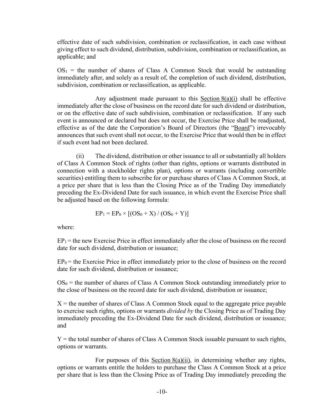 -10- effective date of such subdivision, combination or reclassification, in each case without giving effect to such dividend, distribution, subdivision, combination or reclassification, as applicable; and OS1 = the number of shares of Class A Common Stock that would be outstanding immediately after, and solely as a result of, the completion of such dividend, distribution, subdivision, combination or reclassification, as applicable. Any adjustment made pursuant to this Section 8(a)(i) shall be effective immediately after the close of business on the record date for such dividend or distribution, or on the effective date of such subdivision, combination or reclassification. If any such event is announced or declared but does not occur, the Exercise Price shall be readjusted, effective as of the date the Corporation’s Board of Directors (the “Board”) irrevocably announces that such event shall not occur, to the Exercise Price that would then be in effect if such event had not been declared. (ii) The dividend, distribution or other issuance to all or substantially all holders of Class A Common Stock of rights (other than rights, options or warrants distributed in connection with a stockholder rights plan), options or warrants (including convertible securities) entitling them to subscribe for or purchase shares of Class A Common Stock, at a price per share that is less than the Closing Price as of the Trading Day immediately preceding the Ex-Dividend Date for such issuance, in which event the Exercise Price shall be adjusted based on the following formula: EP1 = EP0 × [(OS0 + X) / (OS0 + Y)] where: EP1 = the new Exercise Price in effect immediately after the close of business on the record date for such dividend, distribution or issuance; EP0 = the Exercise Price in effect immediately prior to the close of business on the record date for such dividend, distribution or issuance; OS0 = the number of shares of Class A Common Stock outstanding immediately prior to the close of business on the record date for such dividend, distribution or issuance; X = the number of shares of Class A Common Stock equal to the aggregate price payable to exercise such rights, options or warrants divided by the Closing Price as of Trading Day immediately preceding the Ex-Dividend Date for such dividend, distribution or issuance; and Y = the total number of shares of Class A Common Stock issuable pursuant to such rights, options or warrants. For purposes of this Section 8(a)(ii), in determining whether any rights, options or warrants entitle the holders to purchase the Class A Common Stock at a price per share that is less than the Closing Price as of Trading Day immediately preceding the