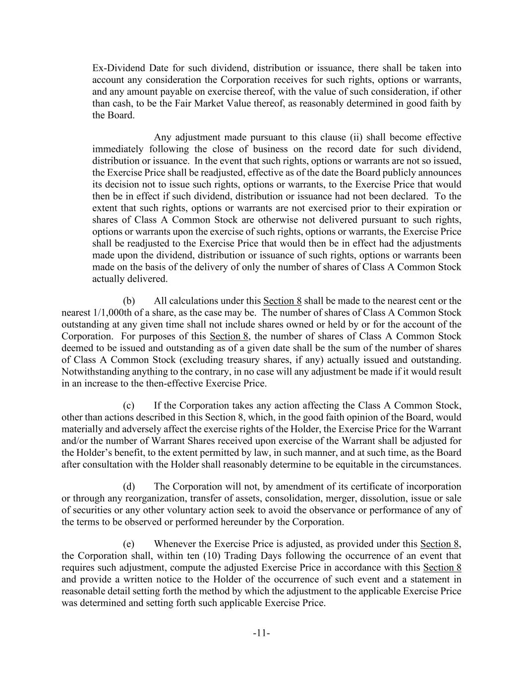 -11- Ex-Dividend Date for such dividend, distribution or issuance, there shall be taken into account any consideration the Corporation receives for such rights, options or warrants, and any amount payable on exercise thereof, with the value of such consideration, if other than cash, to be the Fair Market Value thereof, as reasonably determined in good faith by the Board. Any adjustment made pursuant to this clause (ii) shall become effective immediately following the close of business on the record date for such dividend, distribution or issuance. In the event that such rights, options or warrants are not so issued, the Exercise Price shall be readjusted, effective as of the date the Board publicly announces its decision not to issue such rights, options or warrants, to the Exercise Price that would then be in effect if such dividend, distribution or issuance had not been declared. To the extent that such rights, options or warrants are not exercised prior to their expiration or shares of Class A Common Stock are otherwise not delivered pursuant to such rights, options or warrants upon the exercise of such rights, options or warrants, the Exercise Price shall be readjusted to the Exercise Price that would then be in effect had the adjustments made upon the dividend, distribution or issuance of such rights, options or warrants been made on the basis of the delivery of only the number of shares of Class A Common Stock actually delivered. (b) All calculations under this Section 8 shall be made to the nearest cent or the nearest 1/1,000th of a share, as the case may be. The number of shares of Class A Common Stock outstanding at any given time shall not include shares owned or held by or for the account of the Corporation. For purposes of this Section 8, the number of shares of Class A Common Stock deemed to be issued and outstanding as of a given date shall be the sum of the number of shares of Class A Common Stock (excluding treasury shares, if any) actually issued and outstanding. Notwithstanding anything to the contrary, in no case will any adjustment be made if it would result in an increase to the then-effective Exercise Price. (c) If the Corporation takes any action affecting the Class A Common Stock, other than actions described in this Section 8, which, in the good faith opinion of the Board, would materially and adversely affect the exercise rights of the Holder, the Exercise Price for the Warrant and/or the number of Warrant Shares received upon exercise of the Warrant shall be adjusted for the Holder’s benefit, to the extent permitted by law, in such manner, and at such time, as the Board after consultation with the Holder shall reasonably determine to be equitable in the circumstances. (d) The Corporation will not, by amendment of its certificate of incorporation or through any reorganization, transfer of assets, consolidation, merger, dissolution, issue or sale of securities or any other voluntary action seek to avoid the observance or performance of any of the terms to be observed or performed hereunder by the Corporation. (e) Whenever the Exercise Price is adjusted, as provided under this Section 8, the Corporation shall, within ten (10) Trading Days following the occurrence of an event that requires such adjustment, compute the adjusted Exercise Price in accordance with this Section 8 and provide a written notice to the Holder of the occurrence of such event and a statement in reasonable detail setting forth the method by which the adjustment to the applicable Exercise Price was determined and setting forth such applicable Exercise Price.