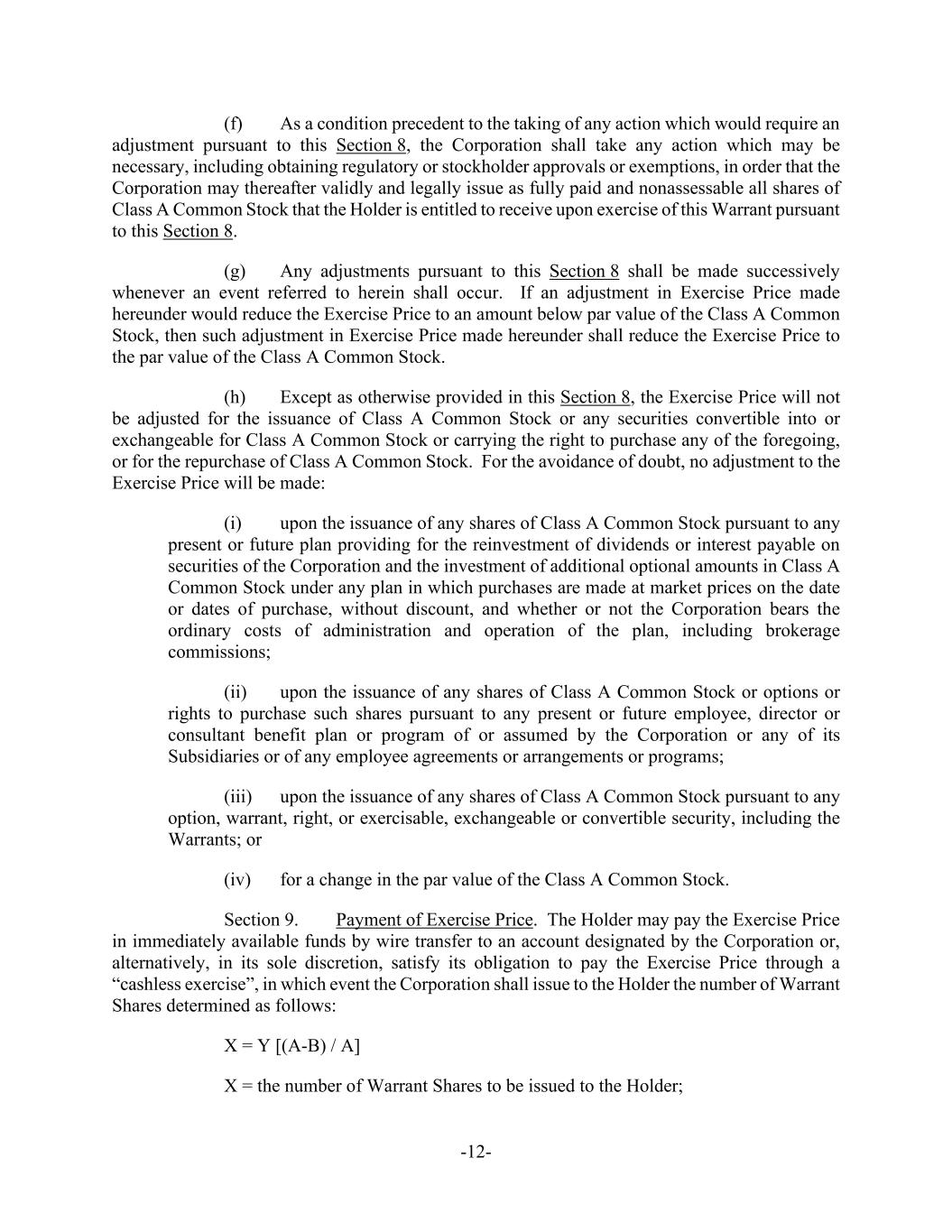 -12- (f) As a condition precedent to the taking of any action which would require an adjustment pursuant to this Section 8, the Corporation shall take any action which may be necessary, including obtaining regulatory or stockholder approvals or exemptions, in order that the Corporation may thereafter validly and legally issue as fully paid and nonassessable all shares of Class A Common Stock that the Holder is entitled to receive upon exercise of this Warrant pursuant to this Section 8. (g) Any adjustments pursuant to this Section 8 shall be made successively whenever an event referred to herein shall occur. If an adjustment in Exercise Price made hereunder would reduce the Exercise Price to an amount below par value of the Class A Common Stock, then such adjustment in Exercise Price made hereunder shall reduce the Exercise Price to the par value of the Class A Common Stock. (h) Except as otherwise provided in this Section 8, the Exercise Price will not be adjusted for the issuance of Class A Common Stock or any securities convertible into or exchangeable for Class A Common Stock or carrying the right to purchase any of the foregoing, or for the repurchase of Class A Common Stock. For the avoidance of doubt, no adjustment to the Exercise Price will be made: (i) upon the issuance of any shares of Class A Common Stock pursuant to any present or future plan providing for the reinvestment of dividends or interest payable on securities of the Corporation and the investment of additional optional amounts in Class A Common Stock under any plan in which purchases are made at market prices on the date or dates of purchase, without discount, and whether or not the Corporation bears the ordinary costs of administration and operation of the plan, including brokerage commissions; (ii) upon the issuance of any shares of Class A Common Stock or options or rights to purchase such shares pursuant to any present or future employee, director or consultant benefit plan or program of or assumed by the Corporation or any of its Subsidiaries or of any employee agreements or arrangements or programs; (iii) upon the issuance of any shares of Class A Common Stock pursuant to any option, warrant, right, or exercisable, exchangeable or convertible security, including the Warrants; or (iv) for a change in the par value of the Class A Common Stock. Section 9. Payment of Exercise Price. The Holder may pay the Exercise Price in immediately available funds by wire transfer to an account designated by the Corporation or, alternatively, in its sole discretion, satisfy its obligation to pay the Exercise Price through a “cashless exercise”, in which event the Corporation shall issue to the Holder the number of Warrant Shares determined as follows: X = Y [(A-B) / A] X = the number of Warrant Shares to be issued to the Holder;