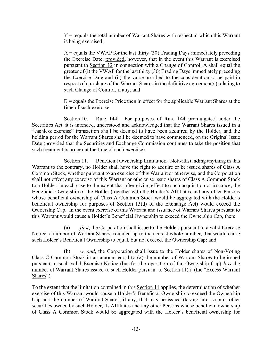 -13- Y = equals the total number of Warrant Shares with respect to which this Warrant is being exercised; A = equals the VWAP for the last thirty (30) Trading Days immediately preceding the Exercise Date; provided, however, that in the event this Warrant is exercised pursuant to Section 12 in connection with a Change of Control, A shall equal the greater of (i) the VWAP for the last thirty (30) Trading Days immediately preceding the Exercise Date and (ii) the value ascribed to the consideration to be paid in respect of one share of the Warrant Shares in the definitive agreement(s) relating to such Change of Control, if any; and B = equals the Exercise Price then in effect for the applicable Warrant Shares at the time of such exercise. Section 10. Rule 144. For purposes of Rule 144 promulgated under the Securities Act, it is intended, understood and acknowledged that the Warrant Shares issued in a “cashless exercise” transaction shall be deemed to have been acquired by the Holder, and the holding period for the Warrant Shares shall be deemed to have commenced, on the Original Issue Date (provided that the Securities and Exchange Commission continues to take the position that such treatment is proper at the time of such exercise). Section 11. Beneficial Ownership Limitation. Notwithstanding anything in this Warrant to the contrary, no Holder shall have the right to acquire or be issued shares of Class A Common Stock, whether pursuant to an exercise of this Warrant or otherwise, and the Corporation shall not effect any exercise of this Warrant or otherwise issue shares of Class A Common Stock to a Holder, in each case to the extent that after giving effect to such acquisition or issuance, the Beneficial Ownership of the Holder (together with the Holder’s Affiliates and any other Persons whose beneficial ownership of Class A Common Stock would be aggregated with the Holder’s beneficial ownership for purposes of Section 13(d) of the Exchange Act) would exceed the Ownership Cap. In the event exercise of this Warrant and issuance of Warrant Shares pursuant to this Warrant would cause a Holder’s Beneficial Ownership to exceed the Ownership Cap, then: (a) first, the Corporation shall issue to the Holder, pursuant to a valid Exercise Notice, a number of Warrant Shares, rounded up to the nearest whole number, that would cause such Holder’s Beneficial Ownership to equal, but not exceed, the Ownership Cap; and (b) second, the Corporation shall issue to the Holder shares of Non-Voting Class C Common Stock in an amount equal to (x) the number of Warrant Shares to be issued pursuant to such valid Exercise Notice (but for the operation of the Ownership Cap) less the number of Warrant Shares issued to such Holder pursuant to Section 11(a) (the “Excess Warrant Shares”). To the extent that the limitation contained in this Section 11 applies, the determination of whether exercise of this Warrant would cause a Holder’s Beneficial Ownership to exceed the Ownership Cap and the number of Warrant Shares, if any, that may be issued (taking into account other securities owned by such Holder, its Affiliates and any other Persons whose beneficial ownership of Class A Common Stock would be aggregated with the Holder’s beneficial ownership for