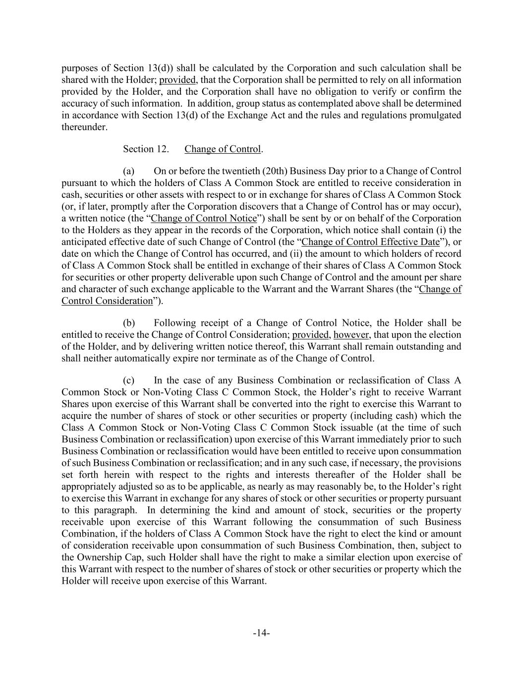 -14- purposes of Section 13(d)) shall be calculated by the Corporation and such calculation shall be shared with the Holder; provided, that the Corporation shall be permitted to rely on all information provided by the Holder, and the Corporation shall have no obligation to verify or confirm the accuracy of such information. In addition, group status as contemplated above shall be determined in accordance with Section 13(d) of the Exchange Act and the rules and regulations promulgated thereunder. Section 12. Change of Control. (a) On or before the twentieth (20th) Business Day prior to a Change of Control pursuant to which the holders of Class A Common Stock are entitled to receive consideration in cash, securities or other assets with respect to or in exchange for shares of Class A Common Stock (or, if later, promptly after the Corporation discovers that a Change of Control has or may occur), a written notice (the “Change of Control Notice”) shall be sent by or on behalf of the Corporation to the Holders as they appear in the records of the Corporation, which notice shall contain (i) the anticipated effective date of such Change of Control (the “Change of Control Effective Date”), or date on which the Change of Control has occurred, and (ii) the amount to which holders of record of Class A Common Stock shall be entitled in exchange of their shares of Class A Common Stock for securities or other property deliverable upon such Change of Control and the amount per share and character of such exchange applicable to the Warrant and the Warrant Shares (the “Change of Control Consideration”). (b) Following receipt of a Change of Control Notice, the Holder shall be entitled to receive the Change of Control Consideration; provided, however, that upon the election of the Holder, and by delivering written notice thereof, this Warrant shall remain outstanding and shall neither automatically expire nor terminate as of the Change of Control. (c) In the case of any Business Combination or reclassification of Class A Common Stock or Non-Voting Class C Common Stock, the Holder’s right to receive Warrant Shares upon exercise of this Warrant shall be converted into the right to exercise this Warrant to acquire the number of shares of stock or other securities or property (including cash) which the Class A Common Stock or Non-Voting Class C Common Stock issuable (at the time of such Business Combination or reclassification) upon exercise of this Warrant immediately prior to such Business Combination or reclassification would have been entitled to receive upon consummation of such Business Combination or reclassification; and in any such case, if necessary, the provisions set forth herein with respect to the rights and interests thereafter of the Holder shall be appropriately adjusted so as to be applicable, as nearly as may reasonably be, to the Holder’s right to exercise this Warrant in exchange for any shares of stock or other securities or property pursuant to this paragraph. In determining the kind and amount of stock, securities or the property receivable upon exercise of this Warrant following the consummation of such Business Combination, if the holders of Class A Common Stock have the right to elect the kind or amount of consideration receivable upon consummation of such Business Combination, then, subject to the Ownership Cap, such Holder shall have the right to make a similar election upon exercise of this Warrant with respect to the number of shares of stock or other securities or property which the Holder will receive upon exercise of this Warrant.