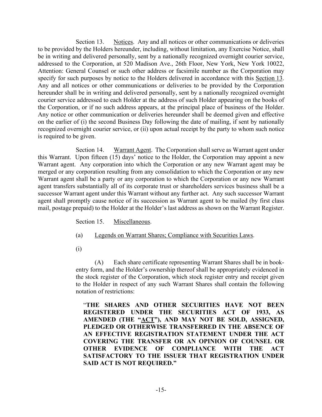 -15- Section 13. Notices. Any and all notices or other communications or deliveries to be provided by the Holders hereunder, including, without limitation, any Exercise Notice, shall be in writing and delivered personally, sent by a nationally recognized overnight courier service, addressed to the Corporation, at 520 Madison Ave., 26th Floor, New York, New York 10022, Attention: General Counsel or such other address or facsimile number as the Corporation may specify for such purposes by notice to the Holders delivered in accordance with this Section 13. Any and all notices or other communications or deliveries to be provided by the Corporation hereunder shall be in writing and delivered personally, sent by a nationally recognized overnight courier service addressed to each Holder at the address of such Holder appearing on the books of the Corporation, or if no such address appears, at the principal place of business of the Holder. Any notice or other communication or deliveries hereunder shall be deemed given and effective on the earlier of (i) the second Business Day following the date of mailing, if sent by nationally recognized overnight courier service, or (ii) upon actual receipt by the party to whom such notice is required to be given. Section 14. Warrant Agent. The Corporation shall serve as Warrant agent under this Warrant. Upon fifteen (15) days’ notice to the Holder, the Corporation may appoint a new Warrant agent. Any corporation into which the Corporation or any new Warrant agent may be merged or any corporation resulting from any consolidation to which the Corporation or any new Warrant agent shall be a party or any corporation to which the Corporation or any new Warrant agent transfers substantially all of its corporate trust or shareholders services business shall be a successor Warrant agent under this Warrant without any further act. Any such successor Warrant agent shall promptly cause notice of its succession as Warrant agent to be mailed (by first class mail, postage prepaid) to the Holder at the Holder’s last address as shown on the Warrant Register. Section 15. Miscellaneous. (a) Legends on Warrant Shares; Compliance with Securities Laws. (i) (A) Each share certificate representing Warrant Shares shall be in book- entry form, and the Holder’s ownership thereof shall be appropriately evidenced in the stock register of the Corporation, which stock register entry and receipt given to the Holder in respect of any such Warrant Shares shall contain the following notation of restrictions: “THE SHARES AND OTHER SECURITIES HAVE NOT BEEN REGISTERED UNDER THE SECURITIES ACT OF 1933, AS AMENDED (THE “ACT”), AND MAY NOT BE SOLD, ASSIGNED, PLEDGED OR OTHERWISE TRANSFERRED IN THE ABSENCE OF AN EFFECTIVE REGISTRATION STATEMENT UNDER THE ACT COVERING THE TRANSFER OR AN OPINION OF COUNSEL OR OTHER EVIDENCE OF COMPLIANCE WITH THE ACT SATISFACTORY TO THE ISSUER THAT REGISTRATION UNDER SAID ACT IS NOT REQUIRED.”