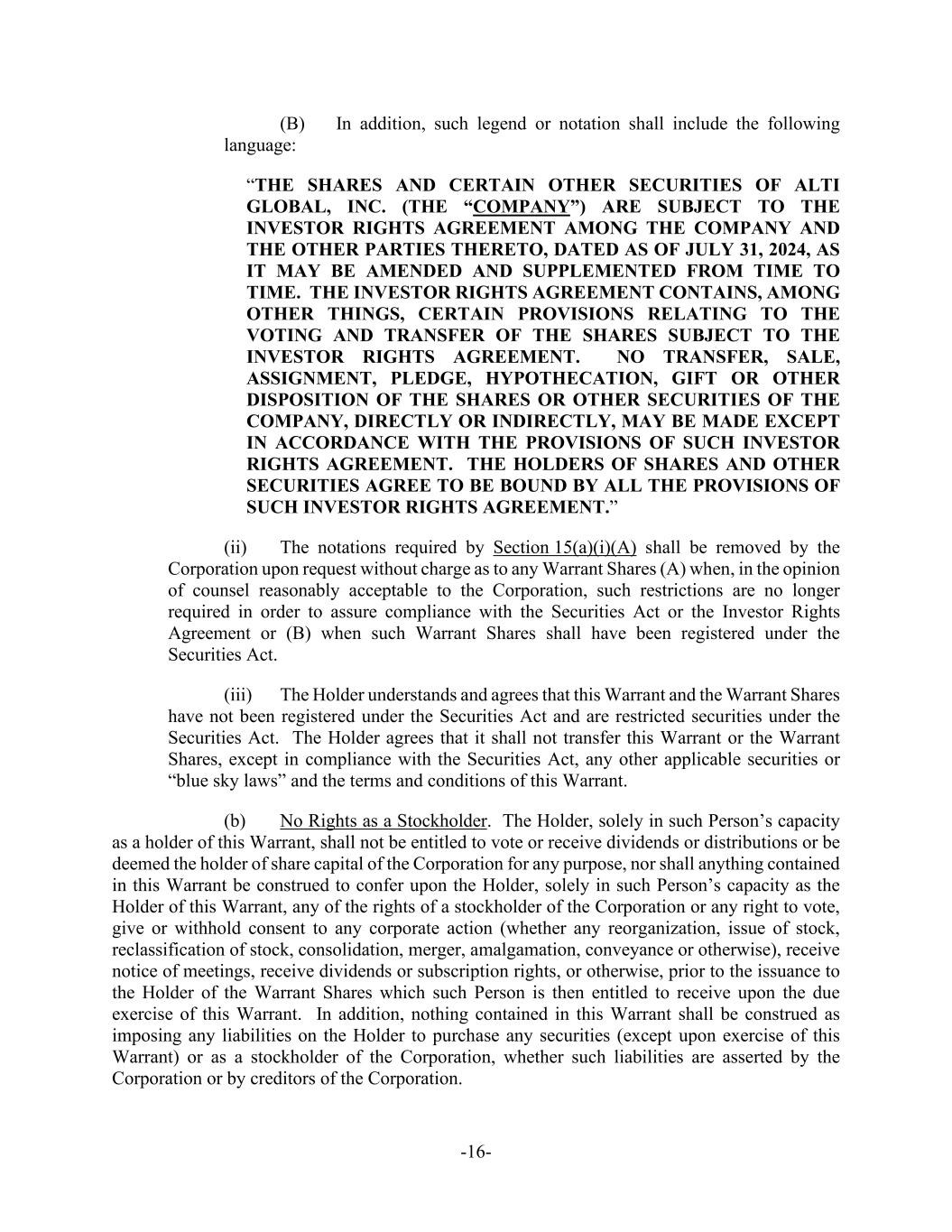 -16- (B) In addition, such legend or notation shall include the following language: “THE SHARES AND CERTAIN OTHER SECURITIES OF ALTI GLOBAL, INC. (THE “COMPANY”) ARE SUBJECT TO THE INVESTOR RIGHTS AGREEMENT AMONG THE COMPANY AND THE OTHER PARTIES THERETO, DATED AS OF JULY 31, 2024, AS IT MAY BE AMENDED AND SUPPLEMENTED FROM TIME TO TIME. THE INVESTOR RIGHTS AGREEMENT CONTAINS, AMONG OTHER THINGS, CERTAIN PROVISIONS RELATING TO THE VOTING AND TRANSFER OF THE SHARES SUBJECT TO THE INVESTOR RIGHTS AGREEMENT. NO TRANSFER, SALE, ASSIGNMENT, PLEDGE, HYPOTHECATION, GIFT OR OTHER DISPOSITION OF THE SHARES OR OTHER SECURITIES OF THE COMPANY, DIRECTLY OR INDIRECTLY, MAY BE MADE EXCEPT IN ACCORDANCE WITH THE PROVISIONS OF SUCH INVESTOR RIGHTS AGREEMENT. THE HOLDERS OF SHARES AND OTHER SECURITIES AGREE TO BE BOUND BY ALL THE PROVISIONS OF SUCH INVESTOR RIGHTS AGREEMENT.” (ii) The notations required by Section 15(a)(i)(A) shall be removed by the Corporation upon request without charge as to any Warrant Shares (A) when, in the opinion of counsel reasonably acceptable to the Corporation, such restrictions are no longer required in order to assure compliance with the Securities Act or the Investor Rights Agreement or (B) when such Warrant Shares shall have been registered under the Securities Act. (iii) The Holder understands and agrees that this Warrant and the Warrant Shares have not been registered under the Securities Act and are restricted securities under the Securities Act. The Holder agrees that it shall not transfer this Warrant or the Warrant Shares, except in compliance with the Securities Act, any other applicable securities or “blue sky laws” and the terms and conditions of this Warrant. (b) No Rights as a Stockholder. The Holder, solely in such Person’s capacity as a holder of this Warrant, shall not be entitled to vote or receive dividends or distributions or be deemed the holder of share capital of the Corporation for any purpose, nor shall anything contained in this Warrant be construed to confer upon the Holder, solely in such Person’s capacity as the Holder of this Warrant, any of the rights of a stockholder of the Corporation or any right to vote, give or withhold consent to any corporate action (whether any reorganization, issue of stock, reclassification of stock, consolidation, merger, amalgamation, conveyance or otherwise), receive notice of meetings, receive dividends or subscription rights, or otherwise, prior to the issuance to the Holder of the Warrant Shares which such Person is then entitled to receive upon the due exercise of this Warrant. In addition, nothing contained in this Warrant shall be construed as imposing any liabilities on the Holder to purchase any securities (except upon exercise of this Warrant) or as a stockholder of the Corporation, whether such liabilities are asserted by the Corporation or by creditors of the Corporation.