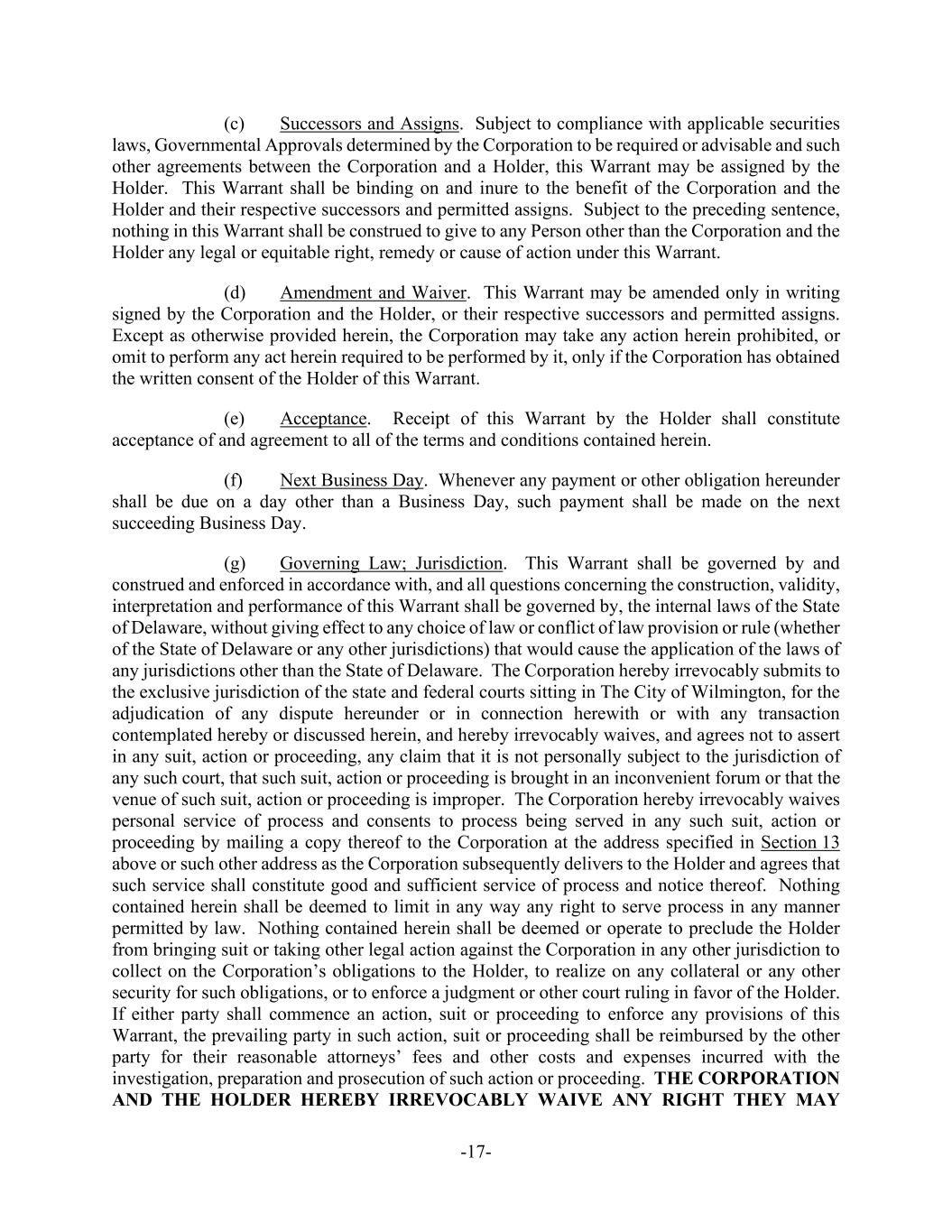 -17- (c) Successors and Assigns. Subject to compliance with applicable securities laws, Governmental Approvals determined by the Corporation to be required or advisable and such other agreements between the Corporation and a Holder, this Warrant may be assigned by the Holder. This Warrant shall be binding on and inure to the benefit of the Corporation and the Holder and their respective successors and permitted assigns. Subject to the preceding sentence, nothing in this Warrant shall be construed to give to any Person other than the Corporation and the Holder any legal or equitable right, remedy or cause of action under this Warrant. (d) Amendment and Waiver. This Warrant may be amended only in writing signed by the Corporation and the Holder, or their respective successors and permitted assigns. Except as otherwise provided herein, the Corporation may take any action herein prohibited, or omit to perform any act herein required to be performed by it, only if the Corporation has obtained the written consent of the Holder of this Warrant. (e) Acceptance. Receipt of this Warrant by the Holder shall constitute acceptance of and agreement to all of the terms and conditions contained herein. (f) Next Business Day. Whenever any payment or other obligation hereunder shall be due on a day other than a Business Day, such payment shall be made on the next succeeding Business Day. (g) Governing Law; Jurisdiction. This Warrant shall be governed by and construed and enforced in accordance with, and all questions concerning the construction, validity, interpretation and performance of this Warrant shall be governed by, the internal laws of the State of Delaware, without giving effect to any choice of law or conflict of law provision or rule (whether of the State of Delaware or any other jurisdictions) that would cause the application of the laws of any jurisdictions other than the State of Delaware. The Corporation hereby irrevocably submits to the exclusive jurisdiction of the state and federal courts sitting in The City of Wilmington, for the adjudication of any dispute hereunder or in connection herewith or with any transaction contemplated hereby or discussed herein, and hereby irrevocably waives, and agrees not to assert in any suit, action or proceeding, any claim that it is not personally subject to the jurisdiction of any such court, that such suit, action or proceeding is brought in an inconvenient forum or that the venue of such suit, action or proceeding is improper. The Corporation hereby irrevocably waives personal service of process and consents to process being served in any such suit, action or proceeding by mailing a copy thereof to the Corporation at the address specified in Section 13 above or such other address as the Corporation subsequently delivers to the Holder and agrees that such service shall constitute good and sufficient service of process and notice thereof. Nothing contained herein shall be deemed to limit in any way any right to serve process in any manner permitted by law. Nothing contained herein shall be deemed or operate to preclude the Holder from bringing suit or taking other legal action against the Corporation in any other jurisdiction to collect on the Corporation’s obligations to the Holder, to realize on any collateral or any other security for such obligations, or to enforce a judgment or other court ruling in favor of the Holder. If either party shall commence an action, suit or proceeding to enforce any provisions of this Warrant, the prevailing party in such action, suit or proceeding shall be reimbursed by the other party for their reasonable attorneys’ fees and other costs and expenses incurred with the investigation, preparation and prosecution of such action or proceeding. THE CORPORATION AND THE HOLDER HEREBY IRREVOCABLY WAIVE ANY RIGHT THEY MAY
