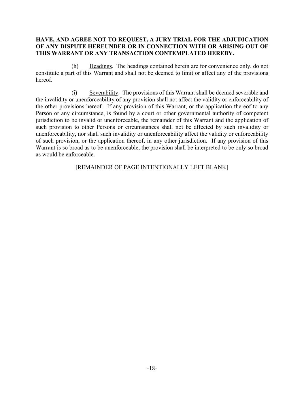 -18- HAVE, AND AGREE NOT TO REQUEST, A JURY TRIAL FOR THE ADJUDICATION OF ANY DISPUTE HEREUNDER OR IN CONNECTION WITH OR ARISING OUT OF THIS WARRANT OR ANY TRANSACTION CONTEMPLATED HEREBY. (h) Headings. The headings contained herein are for convenience only, do not constitute a part of this Warrant and shall not be deemed to limit or affect any of the provisions hereof. (i) Severability. The provisions of this Warrant shall be deemed severable and the invalidity or unenforceability of any provision shall not affect the validity or enforceability of the other provisions hereof. If any provision of this Warrant, or the application thereof to any Person or any circumstance, is found by a court or other governmental authority of competent jurisdiction to be invalid or unenforceable, the remainder of this Warrant and the application of such provision to other Persons or circumstances shall not be affected by such invalidity or unenforceability, nor shall such invalidity or unenforceability affect the validity or enforceability of such provision, or the application thereof, in any other jurisdiction. If any provision of this Warrant is so broad as to be unenforceable, the provision shall be interpreted to be only so broad as would be enforceable. [REMAINDER OF PAGE INTENTIONALLY LEFT BLANK]
