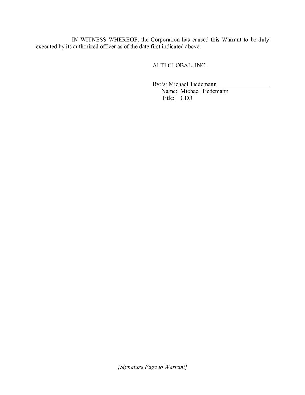 [Signature Page to Warrant] IN WITNESS WHEREOF, the Corporation has caused this Warrant to be duly executed by its authorized officer as of the date first indicated above. ALTI GLOBAL, INC. By: /s/ Michael Tiedemann Name: Michael Tiedemann Title: CEO