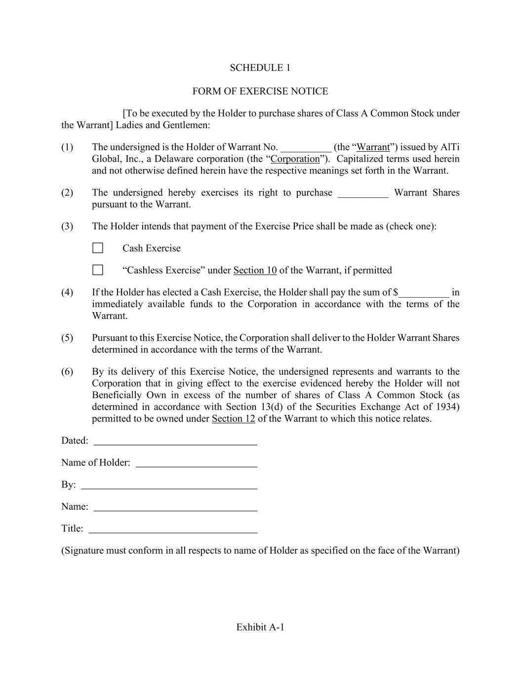 Exhibit A-1 SCHEDULE 1 FORM OF EXERCISE NOTICE [To be executed by the Holder to purchase shares of Class A Common Stock under the Warrant] Ladies and Gentlemen: (1) The undersigned is the Holder of Warrant No. __________ (the “Warrant”) issued by AlTi Global, Inc., a Delaware corporation (the “Corporation”). Capitalized terms used herein and not otherwise defined herein have the respective meanings set forth in the Warrant. (2) The undersigned hereby exercises its right to purchase __________ Warrant Shares pursuant to the Warrant. (3) The Holder intends that payment of the Exercise Price shall be made as (check one): Cash Exercise “Cashless Exercise” under Section 10 of the Warrant, if permitted (4) If the Holder has elected a Cash Exercise, the Holder shall pay the sum of $__________ in immediately available funds to the Corporation in accordance with the terms of the Warrant. (5) Pursuant to this Exercise Notice, the Corporation shall deliver to the Holder Warrant Shares determined in accordance with the terms of the Warrant. (6) By its delivery of this Exercise Notice, the undersigned represents and warrants to the Corporation that in giving effect to the exercise evidenced hereby the Holder will not Beneficially Own in excess of the number of shares of Class A Common Stock (as determined in accordance with Section 13(d) of the Securities Exchange Act of 1934) permitted to be owned under Section 12 of the Warrant to which this notice relates. Dated: Name of Holder: By: Name: Title: (Signature must conform in all respects to name of Holder as specified on the face of the Warrant)