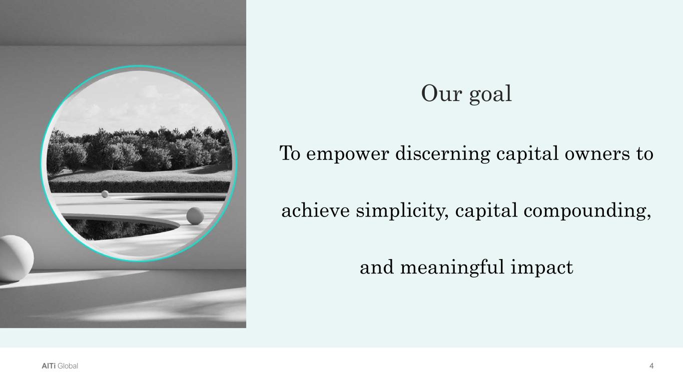 4AlTi Global Our goal To empower discerning capital owners to achieve simplicity, capital compounding, and meaningful impact