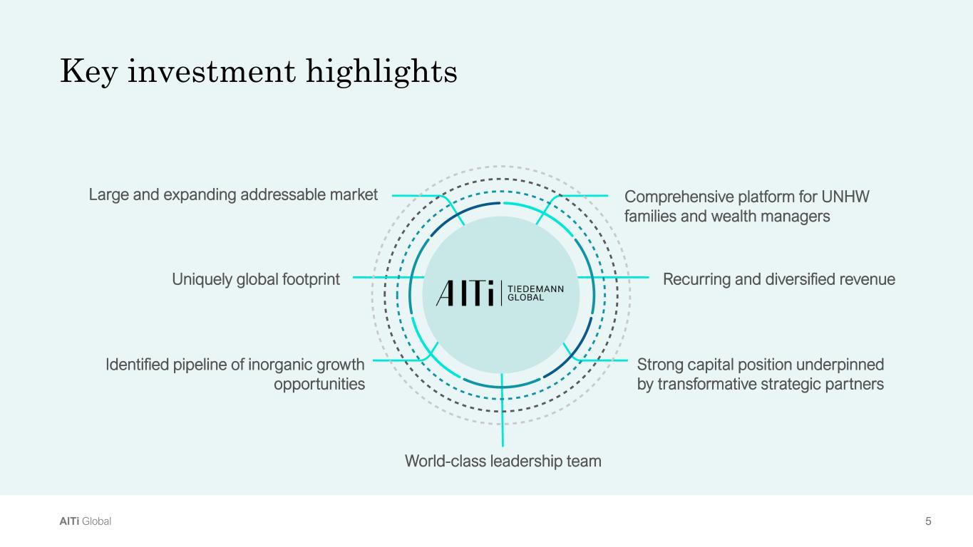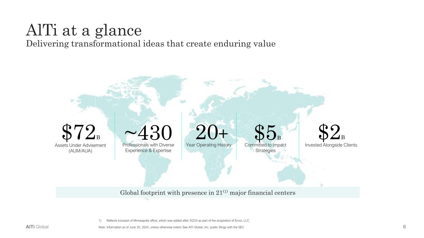 5AlTi Global Key investment highlights Comprehensive platform for UNHW families and wealth managers Large and expanding addressable market Uniquely global footprint Recurring and diversified revenue Strong capital position underpinned by transformative strategic partners Identified pipeline of inorganic growth opportunities World-class leadership team