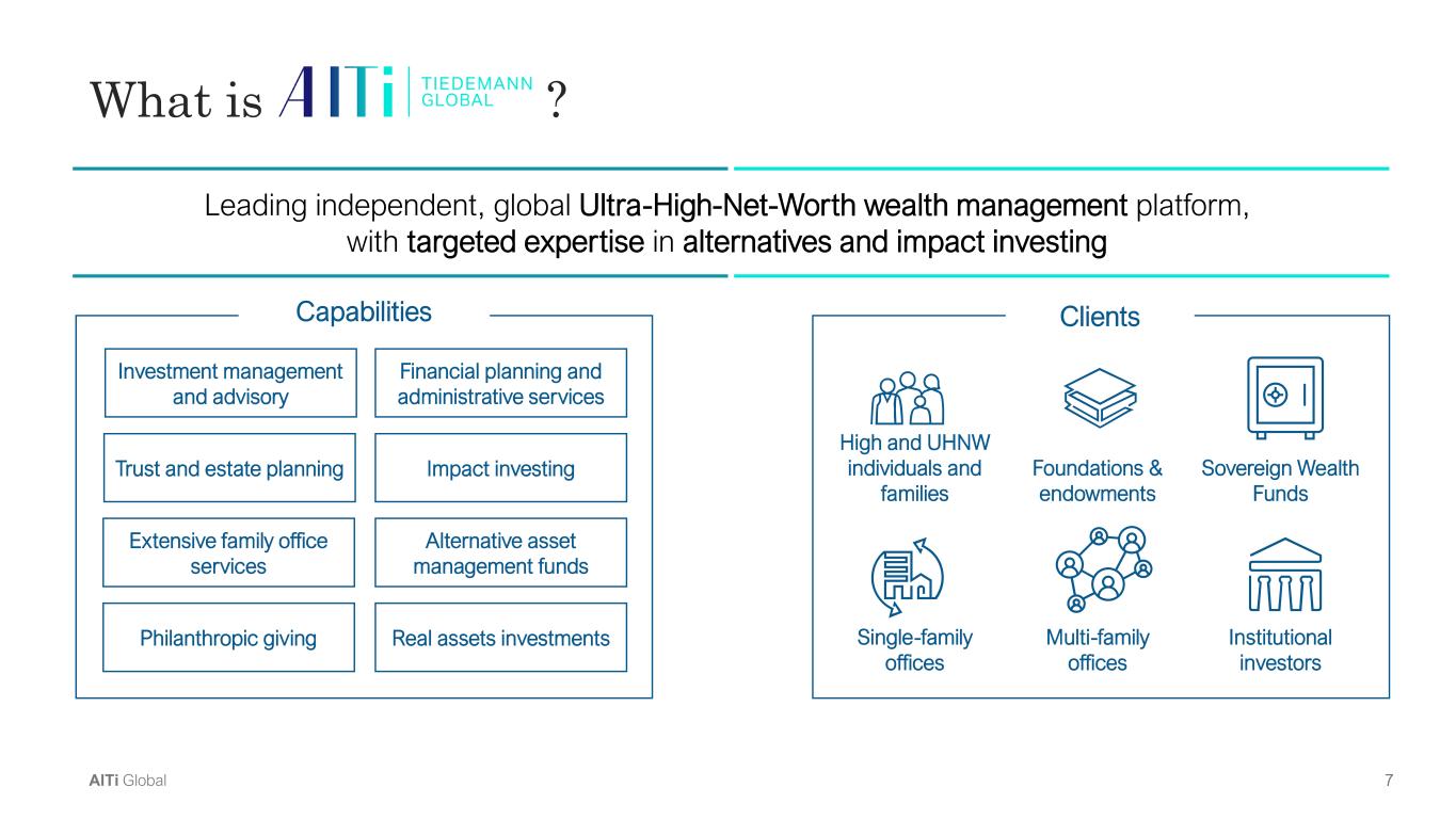 6AlTi Global AlTi at a glance Delivering transformational ideas that create enduring value 1) Reflects inclusion of Minneapolis office, which was added after 2Q'24 as part of the acquisition of Envoi, LLC Note: Information as of June 30, 2024, unless otherwise noted; See AlTi Global, Inc. public filings with the SEC Global footprint with presence in 21(1) major financial centers $72B ~430 Assets Under Advisement (AUM/AUA) Professionals with Diverse Experience & Expertise Committed to Impact Strategies Year Operating History Invested Alongside Clients $2B$5B20+