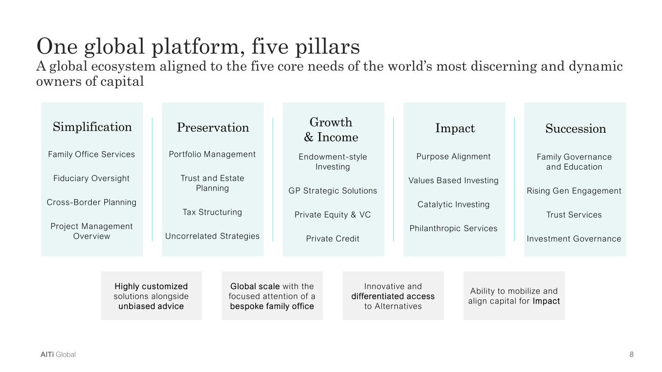 8AlTi Global One global platform, five pillars A global ecosystem aligned to the five core needs of the world’s most discerning and dynamic owners of capital Simplification Family Office Services Fiduciary Oversight Cross-Border Planning Project Management Overview Preservation Portfolio Management Trust and Estate Planning Tax Structuring Uncorrelated Strategies Growth & Income Endowment-style Investing GP Strategic Solutions Private Equity & VC Private Credit Impact Purpose Alignment Values Based Investing Catalytic Investing Philanthropic Services Succession Family Governance and Education Rising Gen Engagement Trust Services Investment Governance Highly customized solutions alongside unbiased advice Innovative and differentiated access to Alternatives Global scale with the focused attention of a bespoke family office Ability to mobilize and align capital for Impact