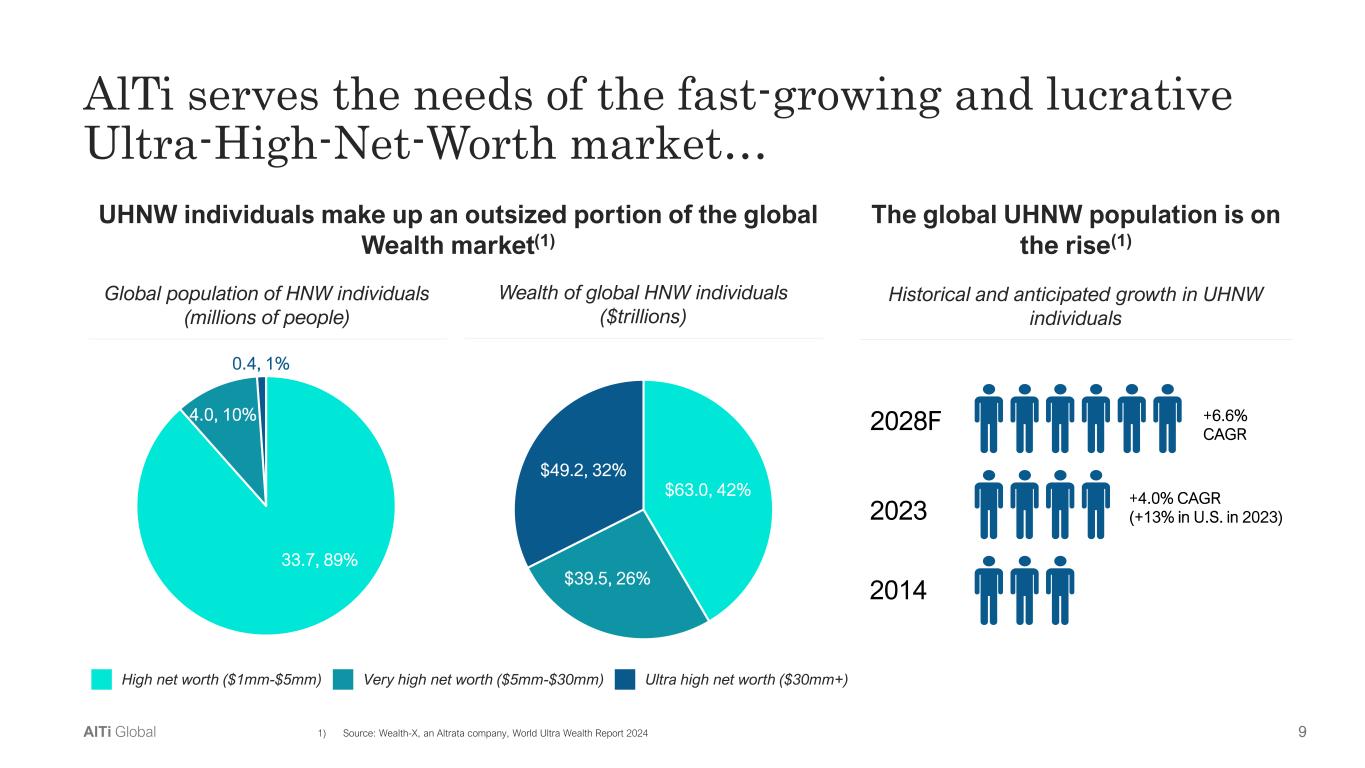 2AlTi Global Notes and Important Disclosures About AlTi Global AlTi Global is a leading independent global wealth and alternatives manager providing entrepreneurs, multi- generational families, institutions, and emerging next-generation leaders with fiduciary capabilities as well as alternative investment strategies and advisory services. AlTi Global’s comprehensive offering is underscored by a commitment to impact or values-aligned investing and generating a net positive impact through its business activities. The firm currently manages or advises on approximately $72 billion in combined assets and has an expansive network across three continents. Forward-Looking Statements Some of the statements in this press release may constitute “forward-looking statements” within the meaning of Section 27A of the Securities Act of 1933 (the “Securities Act”), Section 21E of the Securities Exchange Act of 1934 and the Private Securities Litigation Reform Act of 1995. All statements other than statements of historical fact are forward-looking. Words such as “anticipate,” “believe,” “continue,” “estimate,” “expect,” “future,” “intend,” “may,” “plan” and “will” and similar expressions identify forward-looking statements. Forward-looking statements reflect management’s current plans, estimates and expectations and are inherently uncertain. The inclusion of any forward- looking information in this press release should not be regarded as a representation that the future plans, estimates or expectations contemplated will be achieved. Forward-looking statements are subject to various risks, uncertainties and assumptions. Important factors that could cause actual results to differ materially from those in forward-looking statements include, but are not limited to, global and domestic market and business conditions, successful execution of business and growth strategies and regulatory factors relevant to our business, as well as assumptions relating to our operations, financial results, financial condition, business prospects, growth strategy and liquidity and the risks and uncertainties described in greater detail under “Risk Factors” included in AlTi’s registration statement on Form 10-K filed March 22, 2024, and in the subsequent reports filed with the Securities and Exchange Commission (the “SEC”), as such factors may be updated from time to time. We undertake no obligation to revise or update any forward-looking statements, whether as a result of new information, future events or otherwise, except as may be required by law. Financial Information The financial information and data contained in this Presentation is unaudited and does not conform to Regulation S-X promulgated under the Securities Act. Accordingly, such information and data may not be included in, may be adjusted in or may be presented differently in, any registration statement that may be filed by AlTi Global. Due to rounding, numbers presented throughout this Presentation may not add up precisely to the totals provided and percentages may not precisely reflect the absolute figures. Industry and Market Data Certain information contained in this Presentation relates to or is based on studies, publications, surveys and AlTi Global’s own internal estimates and research. In addition, all of the market data included in this Presentation involves a number of assumptions and limitations, and there can be no guarantee as to the accuracy or reliability of such assumptions. Finally, while AlTi Global believes its internal research is reliable, such research has not been verified by any independent source and none of AlTi Global or any of its affiliates nor any of their respective control persons, officers, directors, employees or representatives make any representation or warranty with respect to the accuracy of such information. Trademarks This Presentation may contain trademarks, service marks, trade names and copyrights of other companies, which are the property of their respective owners. Solely for convenience, some of the trademarks, service marks, trade names and copyrights referred to in this Presentation may be listed without the TM, SM © or ® symbols, but AlTi Global, will assert, to the fullest extent under applicable law, the rights of the applicable owners, if any, to these trademarks, service marks, trade names and copyrights. Use of Non-GAAP Financial Measures The non-GAAP financial measures contained in this presentation (including, without limitation, Adjusted Net Income, Adjusted EBITDA and EBITDA) are not GAAP measures of AlTi Global’s financial performance or liquidity and should not be considered as alternatives to net income (loss) as a measure of financial performance or cash flows from operations as measures of liquidity, or any other performance measure derived in accordance with GAAP. A reconciliation of such non-GAAP measures to their most directly comparable GAAP measure is included in the Appendix of this presentation. You are encouraged to evaluate each adjustment to non-GAAP financial measures and the reasons management considers it appropriate for supplemental analysis. AlTi Global believes that the use of these non-GAAP financial measures provides an additional tool for investors to use in evaluating ongoing operating results and trends. Our presentation of these measures should not be construed as an inference that our future results will be unaffected by unusual or non-recurring items. In addition, these measures may not be comparable to similarly titled measures used by other companies in our industry or across different industries. This Presentation (together with oral statements made in connection herewith, the “Presentation”) is for informational purposes only to assist interested parties in evaluating AlTi Global, Inc. (along with its consolidated subsidiaries, “AlTi Global” or the "Company").