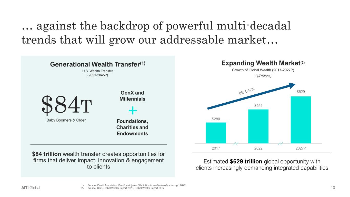 9AlTi Global AlTi serves the needs of the fast-growing and lucrative Ultra-High-Net-Worth market… 1) Source: Wealth-X, an Altrata company, World Ultra Wealth Report 2024 2014 2028F +6.6% CAGR 2023 +4.0% CAGR (+13% in U.S. in 2023) 33.7, 89% 4.0, 10% 0.4, 1% $63.0, 42% $39.5, 26% $49.2, 32% UHNW individuals make up an outsized portion of the global Wealth market(1) Global population of HNW individuals (millions of people) Wealth of global HNW individuals ($trillions) The global UHNW population is on the rise(1) Historical and anticipated growth in UHNW individuals High net worth ($1mm-$5mm) Very high net worth ($5mm-$30mm) Ultra high net worth ($30mm+)