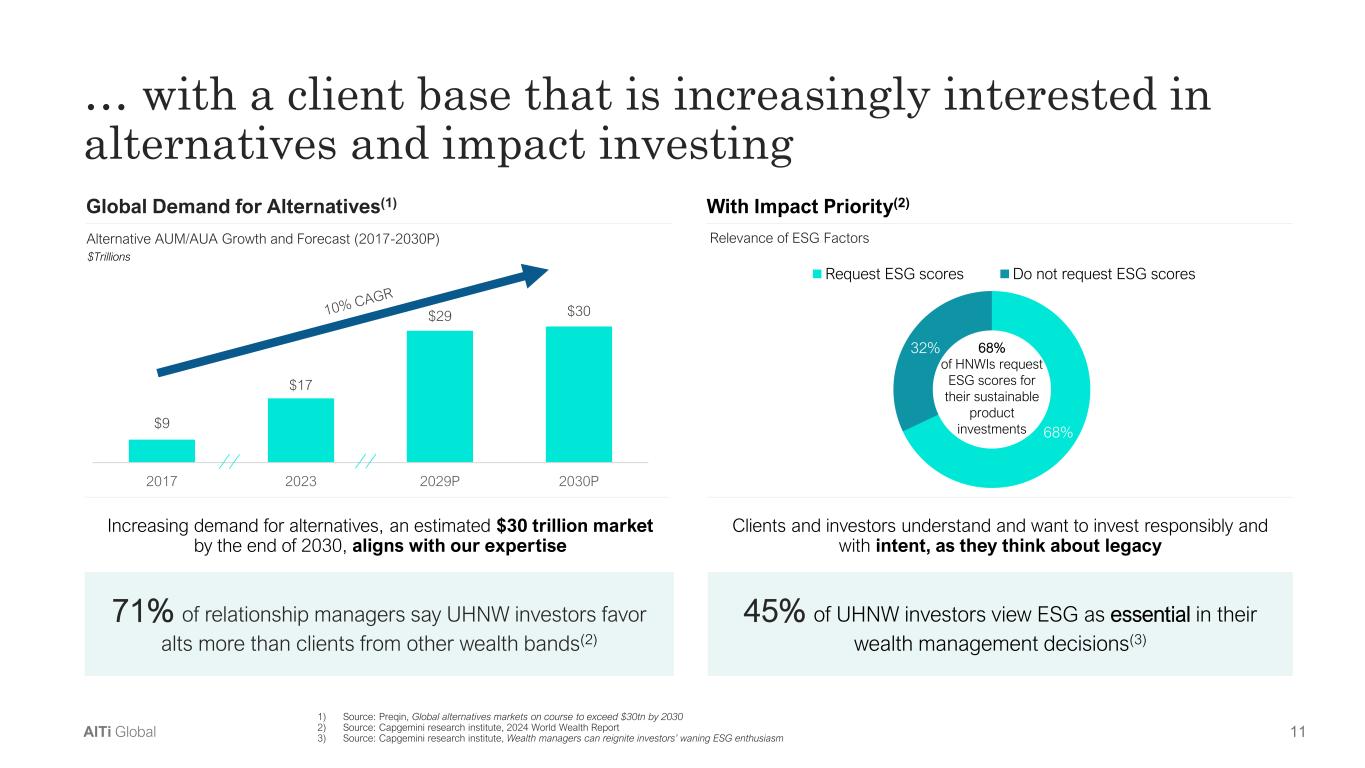 10AlTi Global GenX and Millennials Foundations, Charities and Endowments $84T Baby Boomers & Older Generational Wealth Transfer(1) U.S. Wealth Transfer (2021-2045P) $84 trillion wealth transfer creates opportunities for firms that deliver impact, innovation & engagement to clients 1) Source: Cerulli Associates, Cerulli anticipates $84 trillion in wealth transfers through 2045 2) Source: UBS, Global Wealth Report 2023, Global Wealth Report 2017 … against the backdrop of powerful multi-decadal trends that will grow our addressable market… $280 $454 $629 2017 2022 2027P Growth of Global Wealth (2017-2027P) ($Trillions) Expanding Wealth Market(2) Estimated $629 trillion global opportunity with clients increasingly demanding integrated capabilities