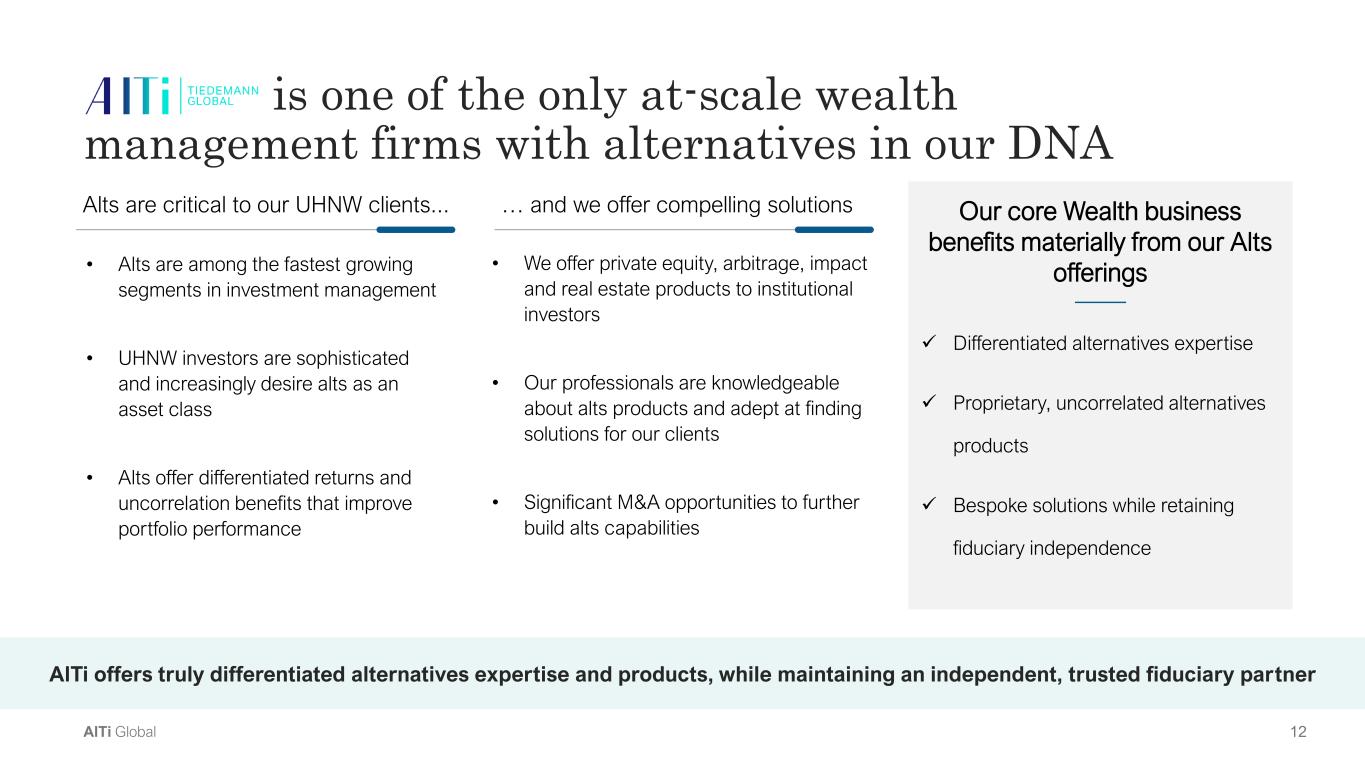 11AlTi Global $9 $17 $29 $30 2017 2023 2029P 2030P … with a client base that is increasingly interested in alternatives and impact investing 1) Source: Preqin, Global alternatives markets on course to exceed $30tn by 2030 2) Source: Capgemini research institute, 2024 World Wealth Report 3) Source: Capgemini research institute, Wealth managers can reignite investors’ waning ESG enthusiasm 71% of relationship managers say UHNW investors favor alts more than clients from other wealth bands(2) Alternative AUM/AUA Growth and Forecast (2017-2030P) Relevance of ESG Factors $Trillions Global Demand for Alternatives(1) Increasing demand for alternatives, an estimated $30 trillion market by the end of 2030, aligns with our expertise Clients and investors understand and want to invest responsibly and with intent, as they think about legacy 68% 32% Request ESG scores Do not request ESG scores 68% of HNWIs request ESG scores for their sustainable product investments 45% of UHNW investors view ESG as essential in their wealth management decisions(3) With Impact Priority(2)