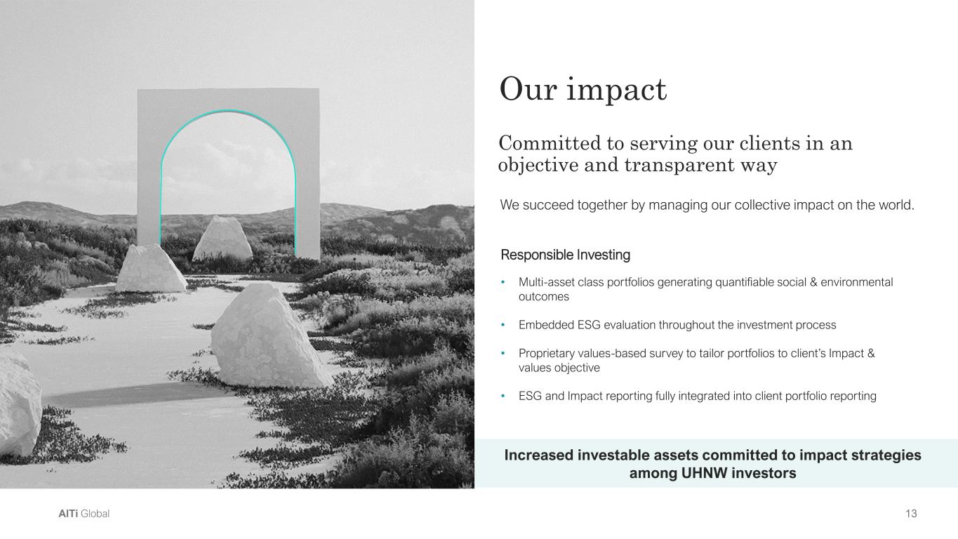 12AlTi Global is one of the only at-scale wealth management firms with alternatives in our DNA AlTi offers truly differentiated alternatives expertise and products, while maintaining an independent, trusted fiduciary partner Alts are critical to our UHNW clients... … and we offer compelling solutions Our core Wealth business benefits materially from our Alts offerings ✓ Differentiated alternatives expertise ✓ Proprietary, uncorrelated alternatives products ✓ Bespoke solutions while retaining fiduciary independence • Alts are among the fastest growing segments in investment management • UHNW investors are sophisticated and increasingly desire alts as an asset class • Alts offer differentiated returns and uncorrelation benefits that improve portfolio performance • We offer private equity, arbitrage, impact and real estate products to institutional investors • Our professionals are knowledgeable about alts products and adept at finding solutions for our clients • Significant M&A opportunities to further build alts capabilities
