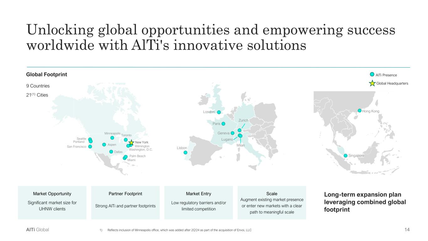 13AlTi Global Our impact Committed to serving our clients in an objective and transparent way Responsible Investing • Multi-asset class portfolios generating quantifiable social & environmental outcomes • Embedded ESG evaluation throughout the investment process • Proprietary values-based survey to tailor portfolios to client’s Impact & values objective • ESG and Impact reporting fully integrated into client portfolio reporting We succeed together by managing our collective impact on the world. Increased investable assets committed to impact strategies among UHNW investors