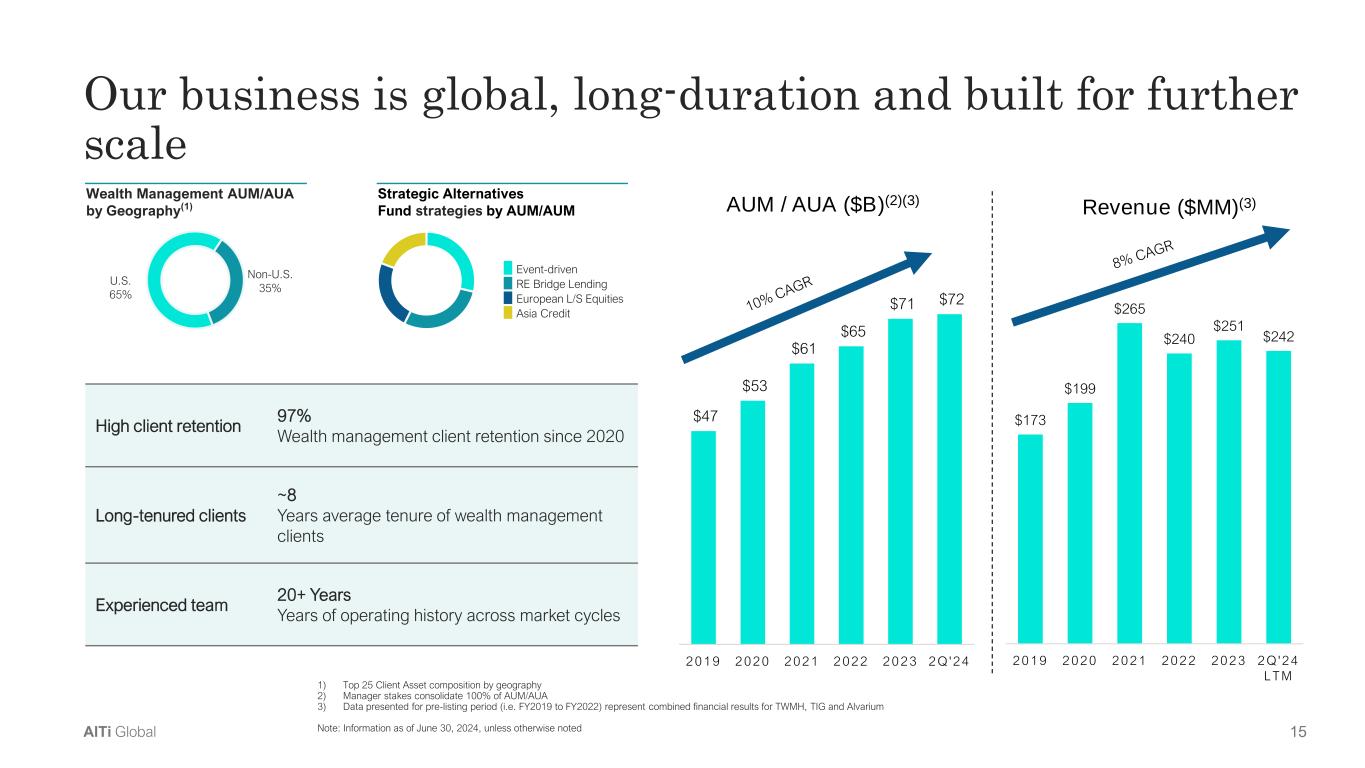 14AlTi Global Toronto Aspen Seattle Portland San Francisco Dallas Miami Minneapolis Washington, D.C. Palm Beach Wilmington New York Lisbon Lugano Geneva Zurich Milan London Paris Singapore Hong Kong Global Footprint Unlocking global opportunities and empowering success worldwide with AlTi's innovative solutions Long-term expansion plan leveraging combined global footprint 9 Countries 21(1) Cities Market Opportunity Significant market size for UHNW clients Partner Footprint Strong AlTi and partner footprints Market Entry Low regulatory barriers and/or limited competition Scale Augment existing market presence or enter new markets with a clear path to meaningful scale AlTi Presence Global Headquarters 1) Reflects inclusion of Minneapolis office, which was added after 2Q'24 as part of the acquisition of Envoi, LLC