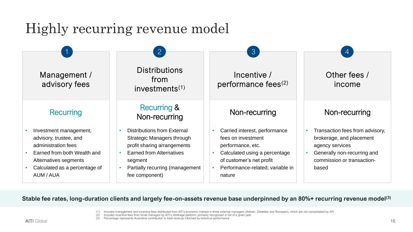 15AlTi Global Our business is global, long-duration and built for further scale 1) Top 25 Client Asset composition by geography 2) Manager stakes consolidate 100% of AUM/AUA 3) Data presented for pre-listing period (i.e. FY2019 to FY2022) represent combined financial results for TWMH, TIG and Alvarium Note: Information as of June 30, 2024, unless otherwise noted Event-driven RE Bridge Lending European L/S Equities Asia Credit Strategic Alternatives Fund strategies by AUM/AUM $47 $53 $61 $65 $71 $72 2 0 1 9 2 0 2 0 2 0 2 1 2 0 2 2 2 0 2 3 2 Q ' 2 4 Wealth Management AUM/AUA by Geography(1) U.S. 65% Non-U.S. 35% AUM / AUA ($B)(2)(3) $173 $199 $265 $240 $251 $242 2 0 1 9 2 0 2 0 2 0 2 1 2 0 2 2 2 0 2 3 2 Q ' 2 4 L T M Revenue ($MM)(3) High client retention 97% Wealth management client retention since 2020 Long-tenured clients ~8 Years average tenure of wealth management clients Experienced team 20+ Years Years of operating history across market cycles