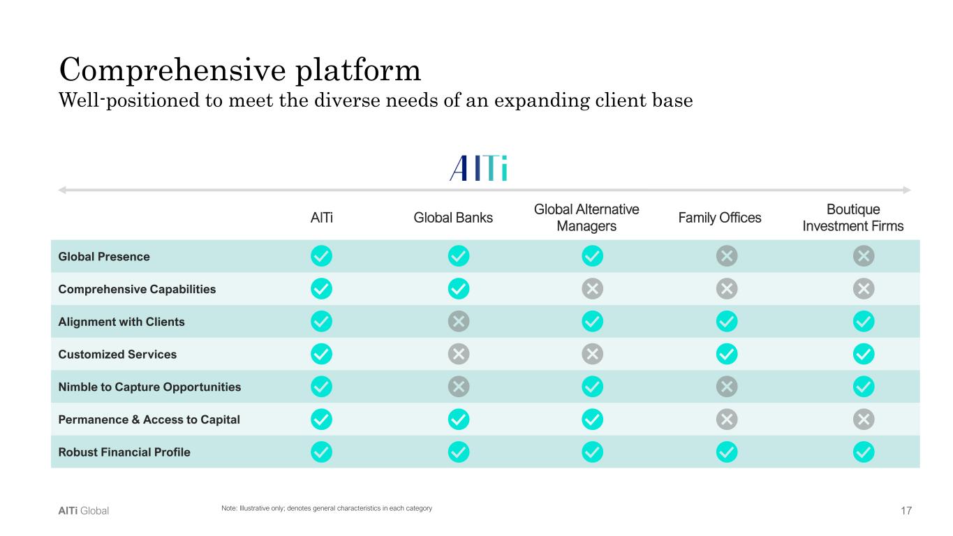 16AlTi Global Highly recurring revenue model (1) Includes management and incentive fees distributed from AlTi’s economic interest in three external managers (Arkkan, Zebedee and Romspen), which are not consolidated by AlTi (2) Includes incentive fees from funds managed by AlTi’s Arbitrage platform; primarily recognized in Q4 of a given year (3) Percentage represents illustrative contribution to total revenue informed by historical performance • Investment management, advisory, trustee, and administration fees • Earned from both Wealth and Alternatives segments • Calculated as a percentage of AUM / AUA Distributions from investments(1) • Distributions from External Strategic Managers through profit sharing arrangements • Earned from Alternatives segment • Partially recurring (management fee component) Recurring & Non-recurring Incentive / performance fees (2) • Carried interest, performance fees on investment performance, etc. • Calculated using a percentage of customer’s net profit • Performance-related; variable in nature Non-recurring 1 Management / advisory fees Recurring 2 4 Other fees / income • Transaction fees from advisory, brokerage, and placement agency services • Generally non-recurring and commission or transaction- based 3 Non-recurring Stable fee rates, long-duration clients and largely fee-on-assets revenue base underpinned by an 80%+ recurring revenue model(3)