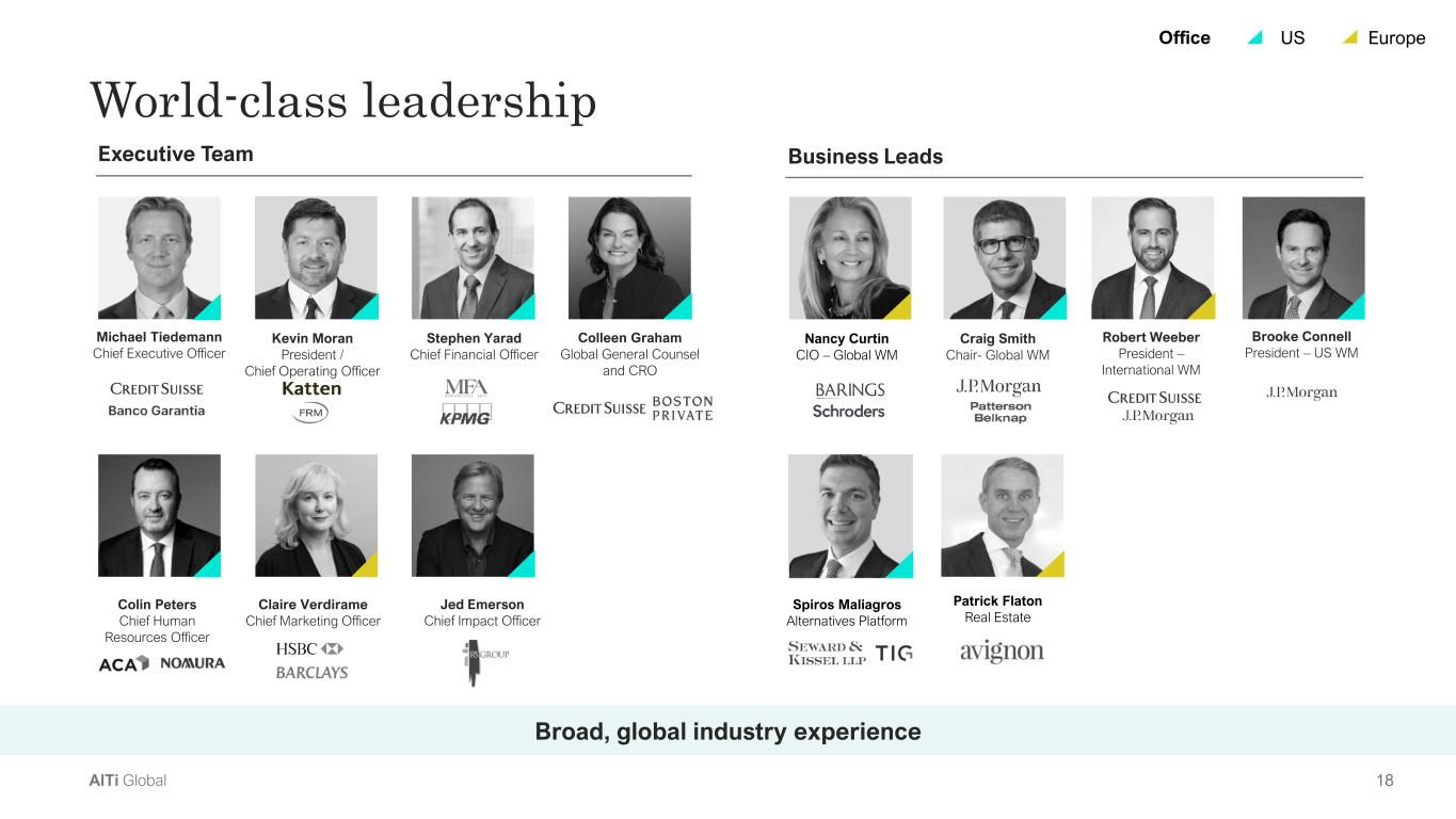 17AlTi Global Comprehensive platform Well-positioned to meet the diverse needs of an expanding client base AlTi Global Banks Global Alternative Managers Family Offices Boutique Investment Firms Global Presence Comprehensive Capabilities Alignment with Clients Customized Services Nimble to Capture Opportunities Permanence & Access to Capital Robust Financial Profile Note: Illustrative only; denotes general characteristics in each category