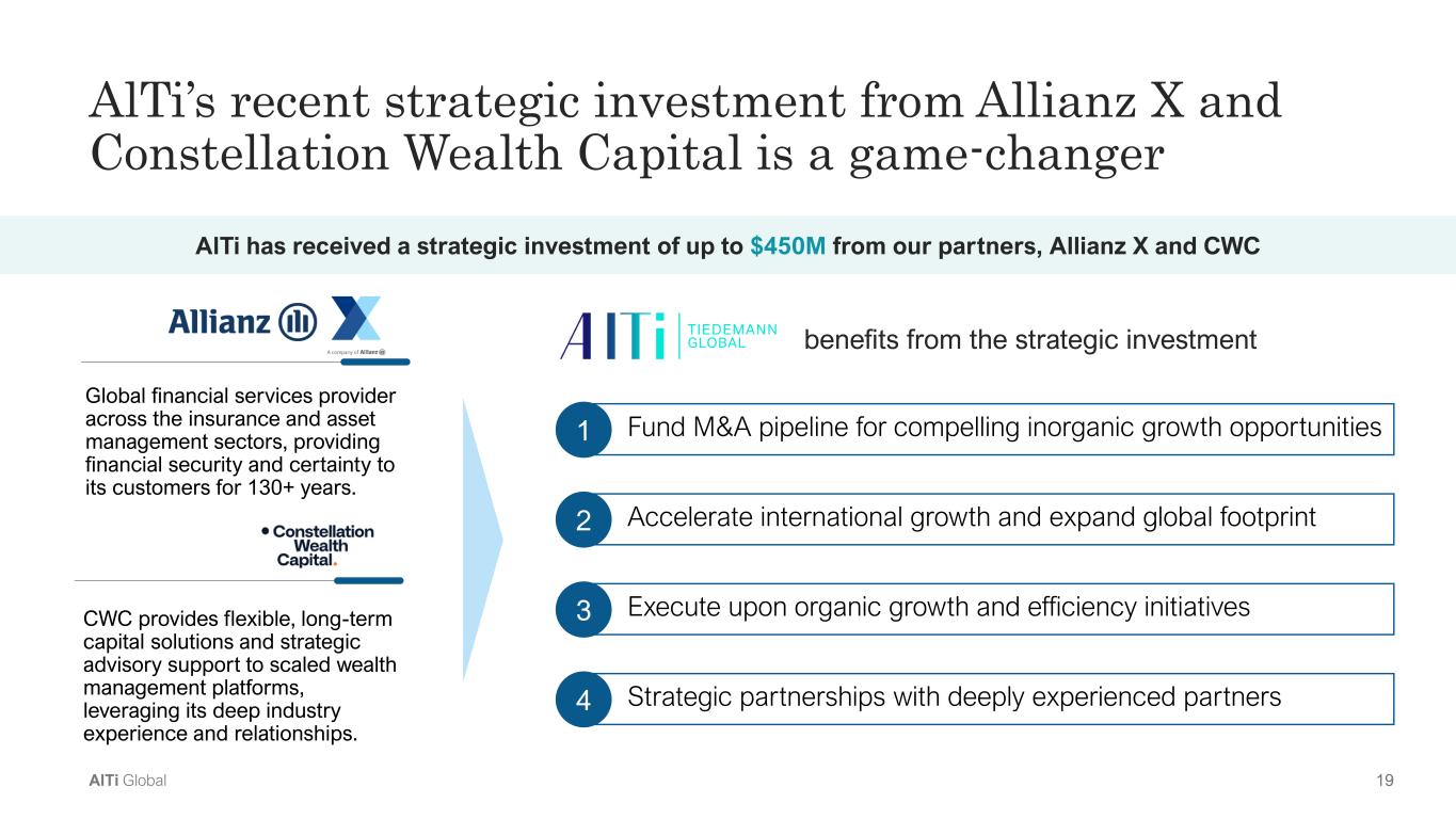 18AlTi Global Broad, global industry experience World-class leadership Michael Tiedemann Chief Executive Officer Kevin Moran President / Chief Operating Officer Stephen Yarad Chief Financial Officer Colleen Graham Global General Counsel and CRO Claire Verdirame Chief Marketing Officer Jed Emerson Chief Impact Officer Executive Team US Europe Business Leads Nancy Curtin CIO – Global WM Brooke Connell President – US WM Craig Smith Chair- Global WM Robert Weeber President – International WM Spiros Maliagros Alternatives Platform Patrick Flaton Real Estate Office Colin Peters Chief Human Resources Officer