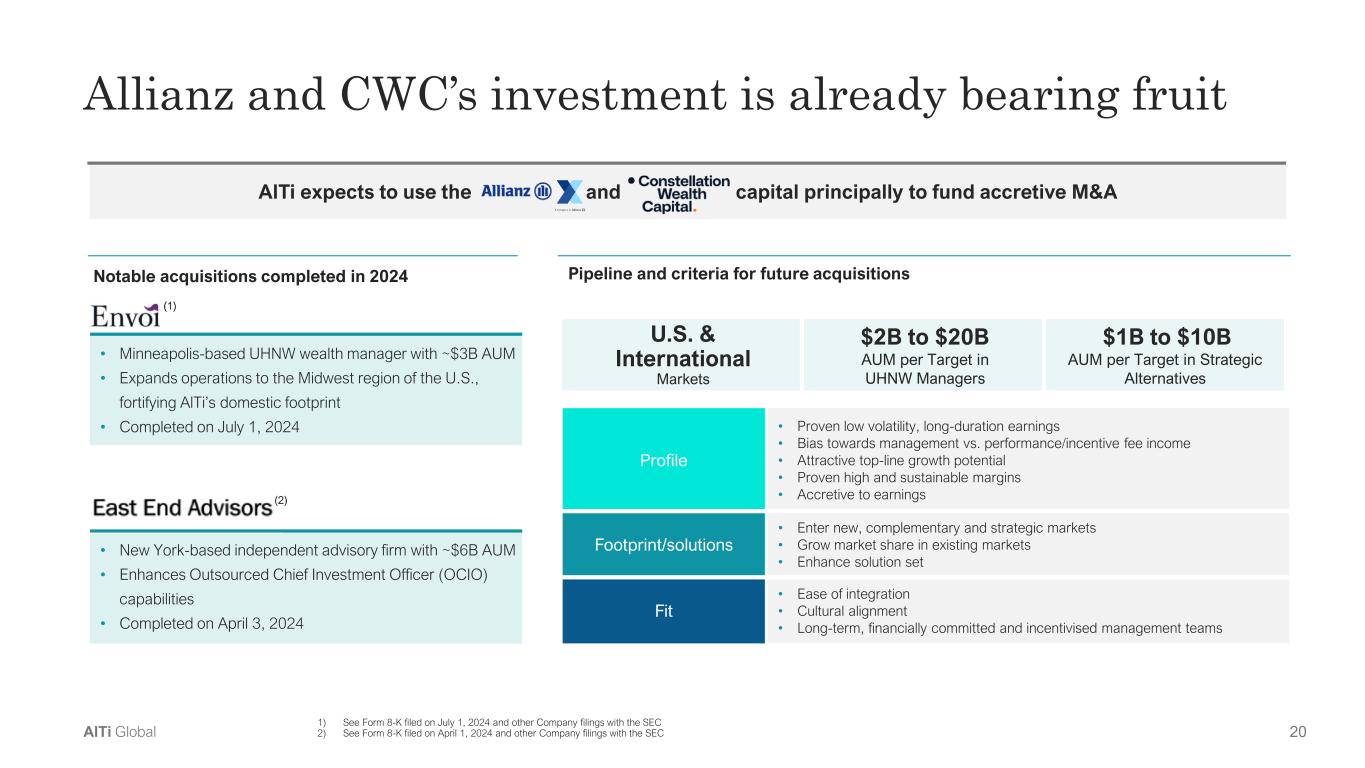 19AlTi Global AlTi’s recent strategic investment from Allianz X and Constellation Wealth Capital is a game-changer Global financial services provider across the insurance and asset management sectors, providing financial security and certainty to its customers for 130+ years. CWC provides flexible, long-term capital solutions and strategic advisory support to scaled wealth management platforms, leveraging its deep industry experience and relationships. AlTi has received a strategic investment of up to $450M from our partners, Allianz X and CWC Fund M&A pipeline for compelling inorganic growth opportunities1 benefits from the strategic investment Accelerate international growth and expand global footprint2 Execute upon organic growth and efficiency initiatives3 Strategic partnerships with deeply experienced partners4