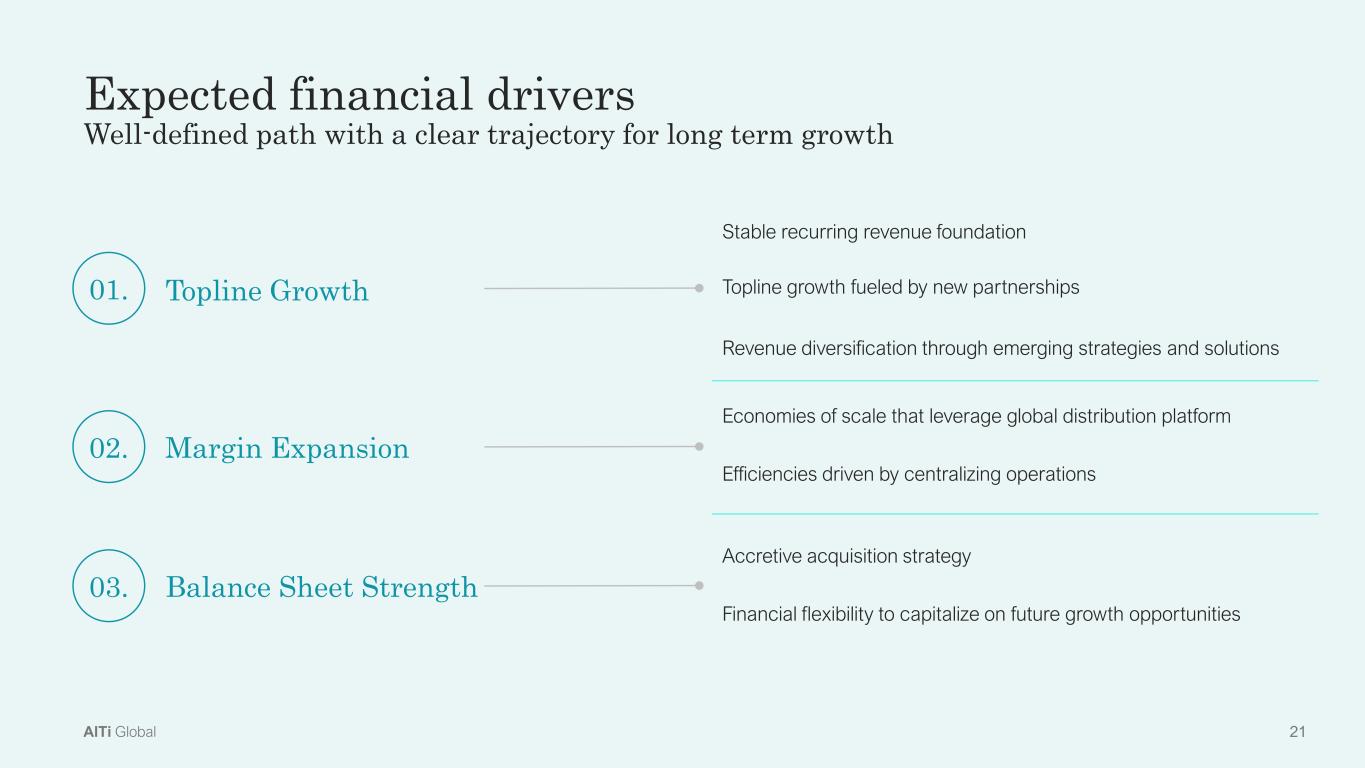 20AlTi Global U.S. & International Markets $2B to $20B AUM per Target in UHNW Managers $1B to $10B AUM per Target in Strategic Alternatives Profile • Proven low volatility, long-duration earnings • Bias towards management vs. performance/incentive fee income • Attractive top-line growth potential • Proven high and sustainable margins • Accretive to earnings Footprint/solutions • Enter new, complementary and strategic markets • Grow market share in existing markets • Enhance solution set Fit • Ease of integration • Cultural alignment • Long-term, financially committed and incentivised management teams Pipeline and criteria for future acquisitions AlTi expects to use the and capital principally to fund accretive M&A • Minneapolis-based UHNW wealth manager with ~$3B AUM • Expands operations to the Midwest region of the U.S., fortifying AlTi’s domestic footprint • Completed on July 1, 2024 • New York-based independent advisory firm with ~$6B AUM • Enhances Outsourced Chief Investment Officer (OCIO) capabilities • Completed on April 3, 2024 Allianz and CWC’s investment is already bearing fruit Notable acquisitions completed in 2024 1) See Form 8-K filed on July 1, 2024 and other Company filings with the SEC 2) See Form 8-K filed on April 1, 2024 and other Company filings with the SEC (1) (2)
