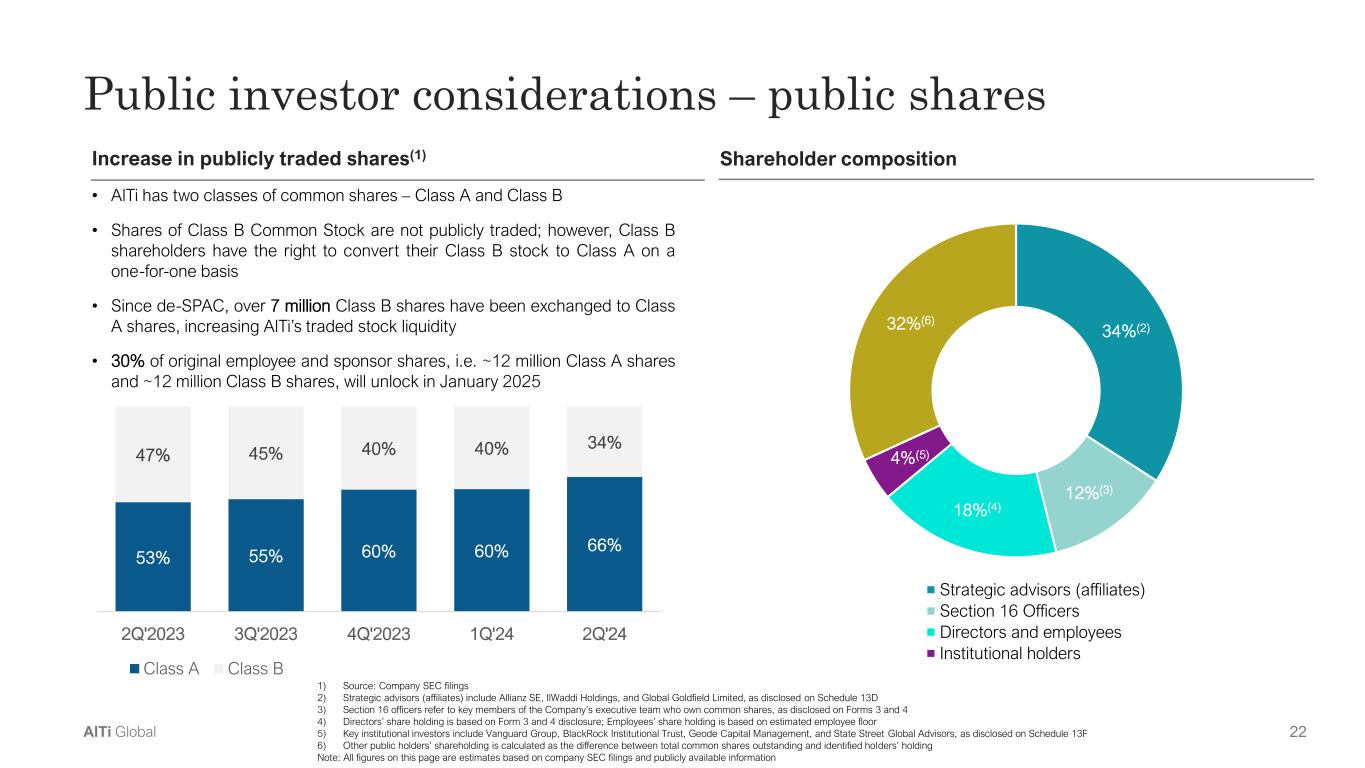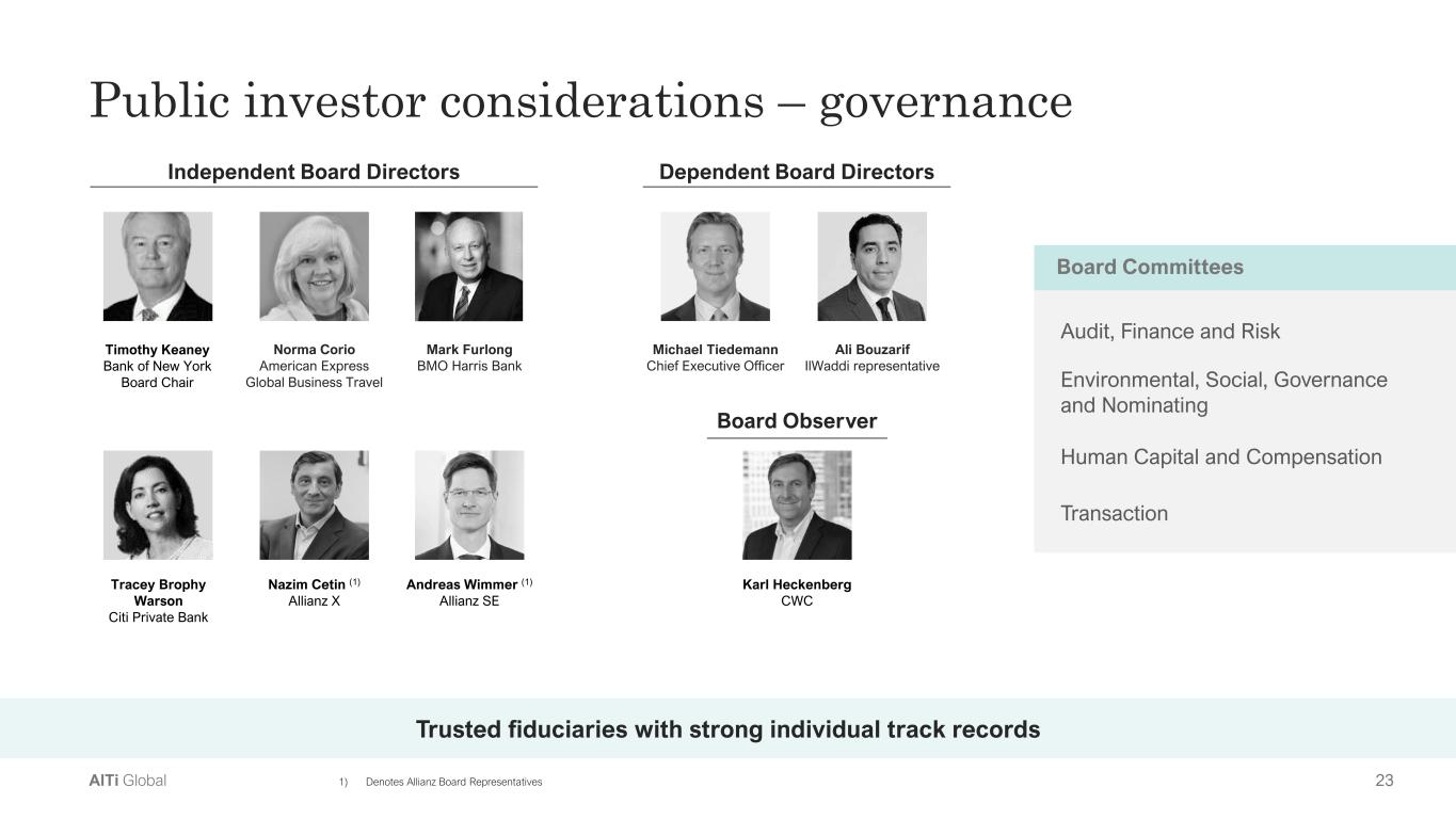 22AlTi Global Public investor considerations – public shares Increase in publicly traded shares(1) • AlTi has two classes of common shares – Class A and Class B • Shares of Class B Common Stock are not publicly traded; however, Class B shareholders have the right to convert their Class B stock to Class A on a one-for-one basis • Since de-SPAC, over 7 million Class B shares have been exchanged to Class A shares, increasing AlTi’s traded stock liquidity • 30% of original employee and sponsor shares, i.e. ~12 million Class A shares and ~12 million Class B shares, will unlock in January 2025 Shareholder composition 34%(2) 12%(3) 18%(4) 4%(5) 32%(6) Strategic advisors (affiliates) Section 16 Officers Directors and employees Institutional holders 53% 55% 60% 60% 66% 47% 45% 40% 40% 34% 2Q'2023 3Q'2023 4Q'2023 1Q'24 2Q'24 Class A Class B 1) Source: Company SEC filings 2) Strategic advisors (affiliates) include Allianz SE, IlWaddi Holdings, and Global Goldfield Limited, as disclosed on Schedule 13D 3) Section 16 officers refer to key members of the Company’s executive team who own common shares, as disclosed on Forms 3 and 4 4) Directors’ share holding is based on Form 3 and 4 disclosure; Employees’ share holding is based on estimated employee floor 5) Key institutional investors include Vanguard Group, BlackRock Institutional Trust, Geode Capital Management, and State Street Global Advisors, as disclosed on Schedule 13F 6) Other public holders’ shareholding is calculated as the difference between total common shares outstanding and identified holders’ holding Note: All figures on this page are estimates based on company SEC filings and publicly available information