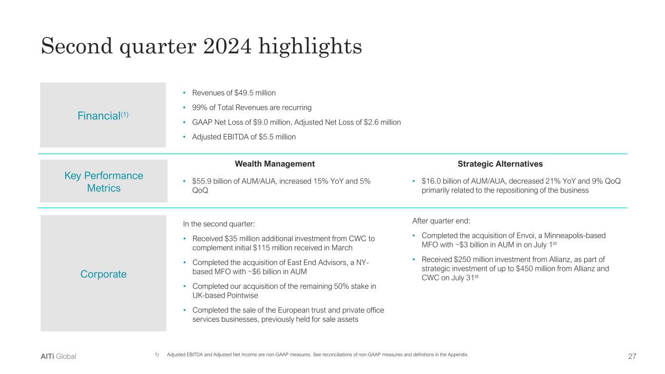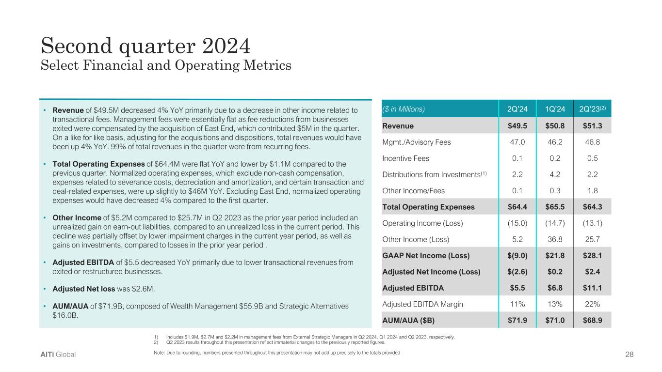 27AlTi Global Financial(1) Key Performance Metrics • Revenues of $49.5 million • 99% of Total Revenues are recurring • GAAP Net Loss of $9.0 million, Adjusted Net Loss of $2.6 million • Adjusted EBITDA of $5.5 million • $55.9 billion of AUM/AUA, increased 15% YoY and 5% QoQ Wealth Management • $16.0 billion of AUM/AUA, decreased 21% YoY and 9% QoQ primarily related to the repositioning of the business Strategic Alternatives Corporate In the second quarter: • Received $35 million additional investment from CWC to complement initial $115 million received in March • Completed the acquisition of East End Advisors, a NY- based MFO with ~$6 billion in AUM • Completed our acquisition of the remaining 50% stake in UK-based Pointwise • Completed the sale of the European trust and private office services businesses, previously held for sale assets After quarter end: • Completed the acquisition of Envoi, a Minneapolis-based MFO with ~$3 billion in AUM in on July 1st • Received $250 million investment from Allianz, as part of strategic investment of up to $450 million from Allianz and CWC on July 31st Second quarter 2024 highlights 1) Adjusted EBITDA and Adjusted Net Income are non-GAAP measures. See reconciliations of non-GAAP measures and definitions in the Appendix.