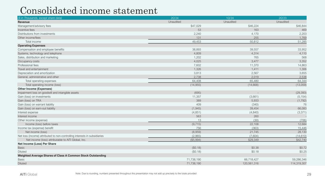 28AlTi Global • Revenue of $49.5M decreased 4% YoY primarily due to a decrease in other income related to transactional fees. Management fees were essentially flat as fee reductions from businesses exited were compensated by the acquisition of East End, which contributed $5M in the quarter. On a like for like basis, adjusting for the acquisitions and dispositions, total revenues would have been up 4% YoY. 99% of total revenues in the quarter were from recurring fees. • Total Operating Expenses of $64.4M were flat YoY and lower by $1.1M compared to the previous quarter. Normalized operating expenses, which exclude non-cash compensation, expenses related to severance costs, depreciation and amortization, and certain transaction and deal-related expenses, were up slightly to $46M YoY. Excluding East End, normalized operating expenses would have decreased 4% compared to the first quarter. • Other Income of $5.2M compared to $25.7M in Q2 2023 as the prior year period included an unrealized gain on earn-out liabilities, compared to an unrealized loss in the current period. This decline was partially offset by lower impairment charges in the current year period, as well as gains on investments, compared to losses in the prior year period . • Adjusted EBITDA of $5.5 decreased YoY primarily due to lower transactional revenues from exited or restructured businesses. • Adjusted Net loss was $2.6M. • AUM/AUA of $71.9B, composed of Wealth Management $55.9B and Strategic Alternatives $16.0B. ($ in Millions) 2Q’24 1Q’24 2Q’23(2) Revenue $49.5 $50.8 $51.3 Mgmt./Advisory Fees 47.0 46.2 46.8 Incentive Fees 0.1 0.2 0.5 Distributions from Investments(1) 2.2 4.2 2.2 Other Income/Fees 0.1 0.3 1.8 Total Operating Expenses $64.4 $65.5 $64.3 Operating Income (Loss) (15.0) (14.7) (13.1) Other Income (Loss) 5.2 36.8 25.7 GAAP Net Income (Loss) $(9.0) $21.8 $28.1 Adjusted Net Income (Loss) $(2.6) $0.2 $2.4 Adjusted EBITDA $5.5 $6.8 $11.1 Adjusted EBITDA Margin 11% 13% 22% AUM/AUA ($B) $71.9 $71.0 $68.9 Second quarter 2024 Select Financial and Operating Metrics 1) Includes $1.9M, $2.7M and $2.2M in management fees from External Strategic Managers in Q2 2024, Q1 2024 and Q2 2023, respectively. 2) Q2 2023 results throughout this presentation reflect immaterial changes to the previously reported figures. Note: Due to rounding, numbers presented throughout this presentation may not add up precisely to the totals provided