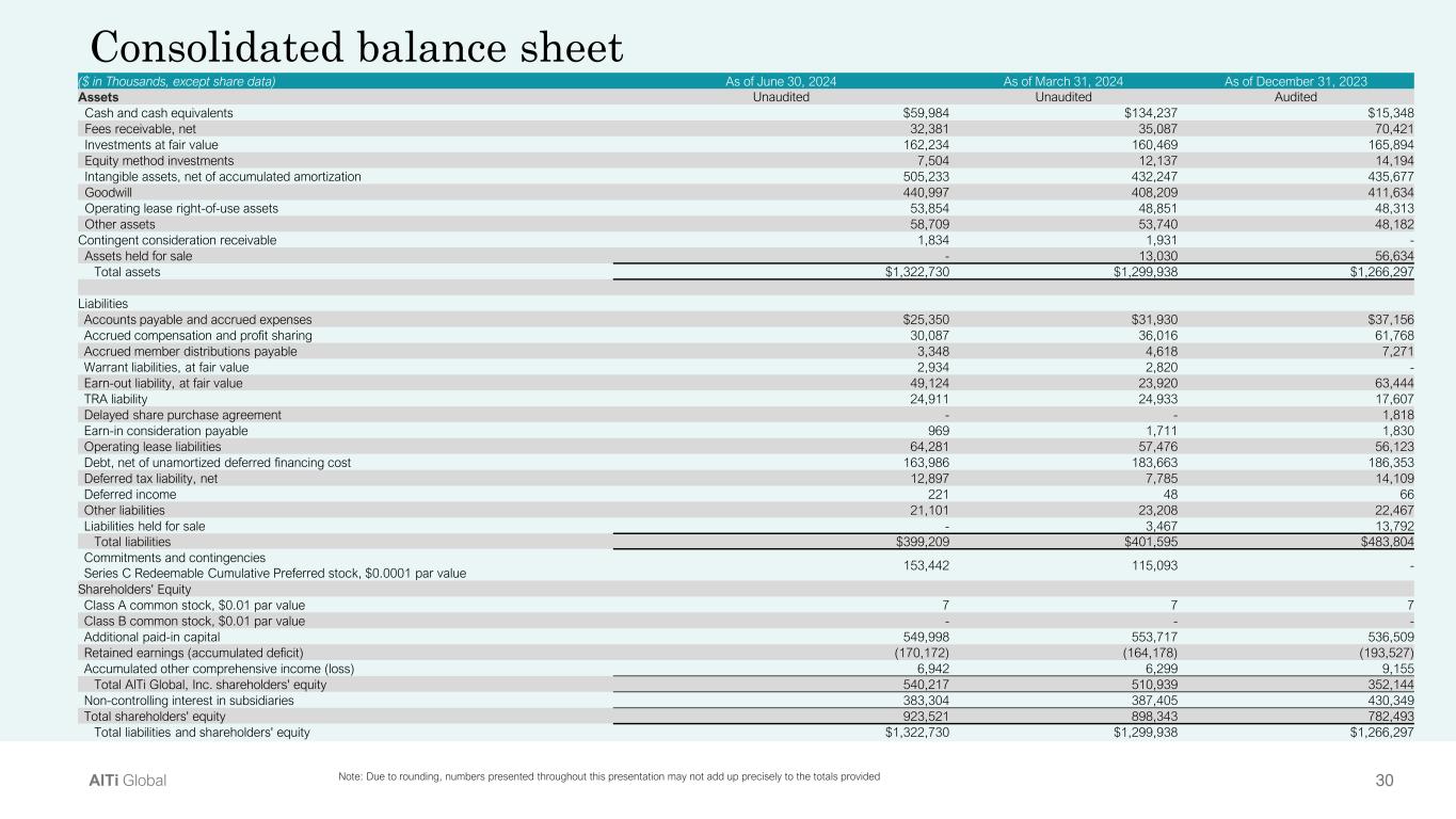 29AlTi Global Consolidated income statement ($ in Thousands, except share data) 2Q’24 1Q’24 2Q’23 Revenue Unaudited Unaudited Unaudited Management/advisory fees $47,029 $46,224 $46,844 Incentive fees 53 163 469 Distributions from investments 2,240 4,170 2,203 Other income/fees 131 255 1,769 Total income 49,453 50,812 51,285 Operating Expenses Compensation and employee benefits 38,893 39,557 33,952 Systems, technology and telephone 4,809 4,314 4,110 Sales, distribution and marketing 1,202 765 568 Occupancy costs 4,025 3,477 3,352 Professional fees 7,602 11,370 14,863 Travel and entertainment 1,326 1,411 1,306 Depreciation and amortization 3,813 2,567 3,655 General, administrative and other 2,738 2,019 2,538 Total operating expenses 64,408 65,480 64,344 Total operating income (loss) (14,955) (14,668) (13,059) Other Income (Expenses) Impairment loss on goodwill and intangible assets (695) - (29,393) Gain (loss) on investments 11,357 (3,661) (5,154) Gain (loss) on TRA 389 5,933 (1,792) Gain (loss) on warrant liability 409 (340) 76 Gain (loss) on earn-out liability (1,945) 39,454 66,083 Interest expense (4,851) (4,840) (3,371) Interest income 563 260 - Other income (expense) 13 (30) (706) Income (loss) before taxes (9,715) 22,108 12,684 Income tax (expense) benefit 756 (363) 15,446 Net income (loss) (8,959) 21,745 28,130 Net loss (income) attributed to non-controlling interests in subsidiaries (2,965) (7,604) (14,610) Net income (loss) attributable to AlTi Global, Inc. ($5,994) $29,349 $42,740 Net Income (Loss) Per Share Basic ($0.18) $0.38 $0.72 Diluted ($0.18) $0.18 $0.25 Weighted Average Shares of Class A Common Stock Outstanding Basic 71,738,190 66,718,427 59,286,346 Diluted 71,738,190 120,561,316 114,319,307 Note: Due to rounding, numbers presented throughout this presentation may not add up precisely to the totals provided