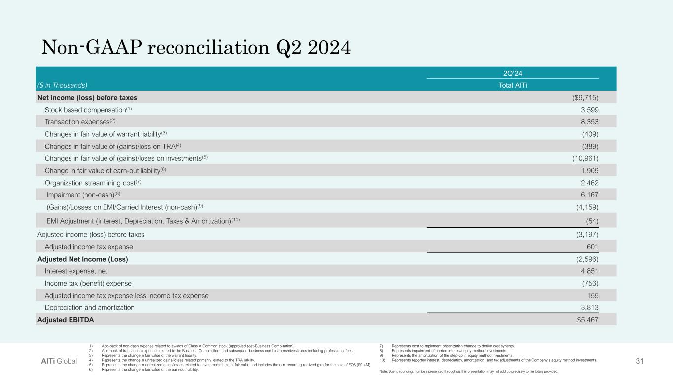 30AlTi Global Consolidated balance sheet ($ in Thousands, except share data) As of June 30, 2024 As of March 31, 2024 As of December 31, 2023 Assets Unaudited Unaudited Audited Cash and cash equivalents $59,984 $134,237 $15,348 Fees receivable, net 32,381 35,087 70,421 Investments at fair value 162,234 160,469 165,894 Equity method investments 7,504 12,137 14,194 Intangible assets, net of accumulated amortization 505,233 432,247 435,677 Goodwill 440,997 408,209 411,634 Operating lease right-of-use assets 53,854 48,851 48,313 Other assets 58,709 53,740 48,182 Contingent consideration receivable 1,834 1,931 - Assets held for sale - 13,030 56,634 Total assets $1,322,730 $1,299,938 $1,266,297 Liabilities Accounts payable and accrued expenses $25,350 $31,930 $37,156 Accrued compensation and profit sharing 30,087 36,016 61,768 Accrued member distributions payable 3,348 4,618 7,271 Warrant liabilities, at fair value 2,934 2,820 - Earn-out liability, at fair value 49,124 23,920 63,444 TRA liability 24,911 24,933 17,607 Delayed share purchase agreement - - 1,818 Earn-in consideration payable 969 1,711 1,830 Operating lease liabilities 64,281 57,476 56,123 Debt, net of unamortized deferred financing cost 163,986 183,663 186,353 Deferred tax liability, net 12,897 7,785 14,109 Deferred income 221 48 66 Other liabilities 21,101 23,208 22,467 Liabilities held for sale - 3,467 13,792 Total liabilities $399,209 $401,595 $483,804 Commitments and contingencies Series C Redeemable Cumulative Preferred stock, $0.0001 par value 153,442 115,093 - Shareholders' Equity Class A common stock, $0.01 par value 7 7 7 Class B common stock, $0.01 par value - - - Additional paid-in capital 549,998 553,717 536,509 Retained earnings (accumulated deficit) (170,172) (164,178) (193,527) Accumulated other comprehensive income (loss) 6,942 6,299 9,155 Total AlTi Global, Inc. shareholders' equity 540,217 510,939 352,144 Non-controlling interest in subsidiaries 383,304 387,405 430,349 Total shareholders' equity 923,521 898,343 782,493 Total liabilities and shareholders' equity $1,322,730 $1,299,938 $1,266,297 Note: Due to rounding, numbers presented throughout this presentation may not add up precisely to the totals provided