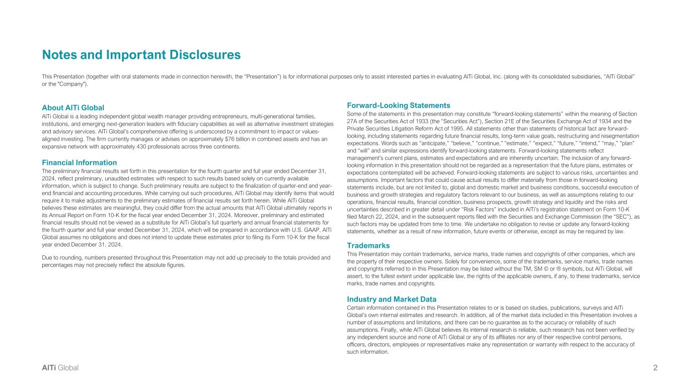 2AlTi Global Notes and Important Disclosures About AlTi Global AlTi Global is a leading independent global wealth manager providing entrepreneurs, multi-generational families, institutions, and emerging next-generation leaders with fiduciary capabilities as well as alternative investment strategies and advisory services. AlTi Global’s comprehensive offering is underscored by a commitment to impact or values- aligned investing. The firm currently manages or advises on approximately $76 billion in combined assets and has an expansive network with approximately 430 professionals across three continents. Financial Information The preliminary financial results set forth in this presentation for the fourth quarter and full year ended December 31, 2024, reflect preliminary, unaudited estimates with respect to such results based solely on currently available information, which is subject to change. Such preliminary results are subject to the finalization of quarter-end and year- end financial and accounting procedures. While carrying out such procedures, AlTi Global may identify items that would require it to make adjustments to the preliminary estimates of financial results set forth herein. While AlTi Global believes these estimates are meaningful, they could differ from the actual amounts that AlTi Global ultimately reports in its Annual Report on Form 10-K for the fiscal year ended December 31, 2024. Moreover, preliminary and estimated financial results should not be viewed as a substitute for AlTi Global’s full quarterly and annual financial statements for the fourth quarter and full year ended December 31, 2024, which will be prepared in accordance with U.S. GAAP. AlTi Global assumes no obligations and does not intend to update these estimates prior to filing its Form 10-K for the fiscal year ended December 31, 2024. Due to rounding, numbers presented throughout this Presentation may not add up precisely to the totals provided and percentages may not precisely reflect the absolute figures. This Presentation (together with oral statements made in connection herewith, the “Presentation”) is for informational purposes only to assist interested parties in evaluating AlTi Global, Inc. (along with its consolidated subsidiaries, “AlTi Global” or the "Company"). Forward-Looking Statements Some of the statements in this presentation may constitute “forward-looking statements” within the meaning of Section 27A of the Securities Act of 1933 (the “Securities Act”), Section 21E of the Securities Exchange Act of 1934 and the Private Securities Litigation Reform Act of 1995. All statements other than statements of historical fact are forward- looking, including statements regarding future financial results, long-term value goals, restructuring and resegmentation expectations. Words such as “anticipate,” “believe,” “continue,” “estimate,” “expect,” “future,” “intend,” “may,” “plan” and “will” and similar expressions identify forward-looking statements. Forward-looking statements reflect management’s current plans, estimates and expectations and are inherently uncertain. The inclusion of any forward- looking information in this presentation should not be regarded as a representation that the future plans, estimates or expectations contemplated will be achieved. Forward-looking statements are subject to various risks, uncertainties and assumptions. Important factors that could cause actual results to differ materially from those in forward-looking statements include, but are not limited to, global and domestic market and business conditions, successful execution of business and growth strategies and regulatory factors relevant to our business, as well as assumptions relating to our operations, financial results, financial condition, business prospects, growth strategy and liquidity and the risks and uncertainties described in greater detail under “Risk Factors” included in AlTi’s registration statement on Form 10-K filed March 22, 2024, and in the subsequent reports filed with the Securities and Exchange Commission (the “SEC”), as such factors may be updated from time to time. We undertake no obligation to revise or update any forward-looking statements, whether as a result of new information, future events or otherwise, except as may be required by law. Trademarks This Presentation may contain trademarks, service marks, trade names and copyrights of other companies, which are the property of their respective owners. Solely for convenience, some of the trademarks, service marks, trade names and copyrights referred to in this Presentation may be listed without the TM, SM © or ® symbols, but AlTi Global, will assert, to the fullest extent under applicable law, the rights of the applicable owners, if any, to these trademarks, service marks, trade names and copyrights. Industry and Market Data Certain information contained in this Presentation relates to or is based on studies, publications, surveys and AlTi Global’s own internal estimates and research. In addition, all of the market data included in this Presentation involves a number of assumptions and limitations, and there can be no guarantee as to the accuracy or reliability of such assumptions. Finally, while AlTi Global believes its internal research is reliable, such research has not been verified by any independent source and none of AlTi Global or any of its affiliates nor any of their respective control persons, officers, directors, employees or representatives make any representation or warranty with respect to the accuracy of such information.