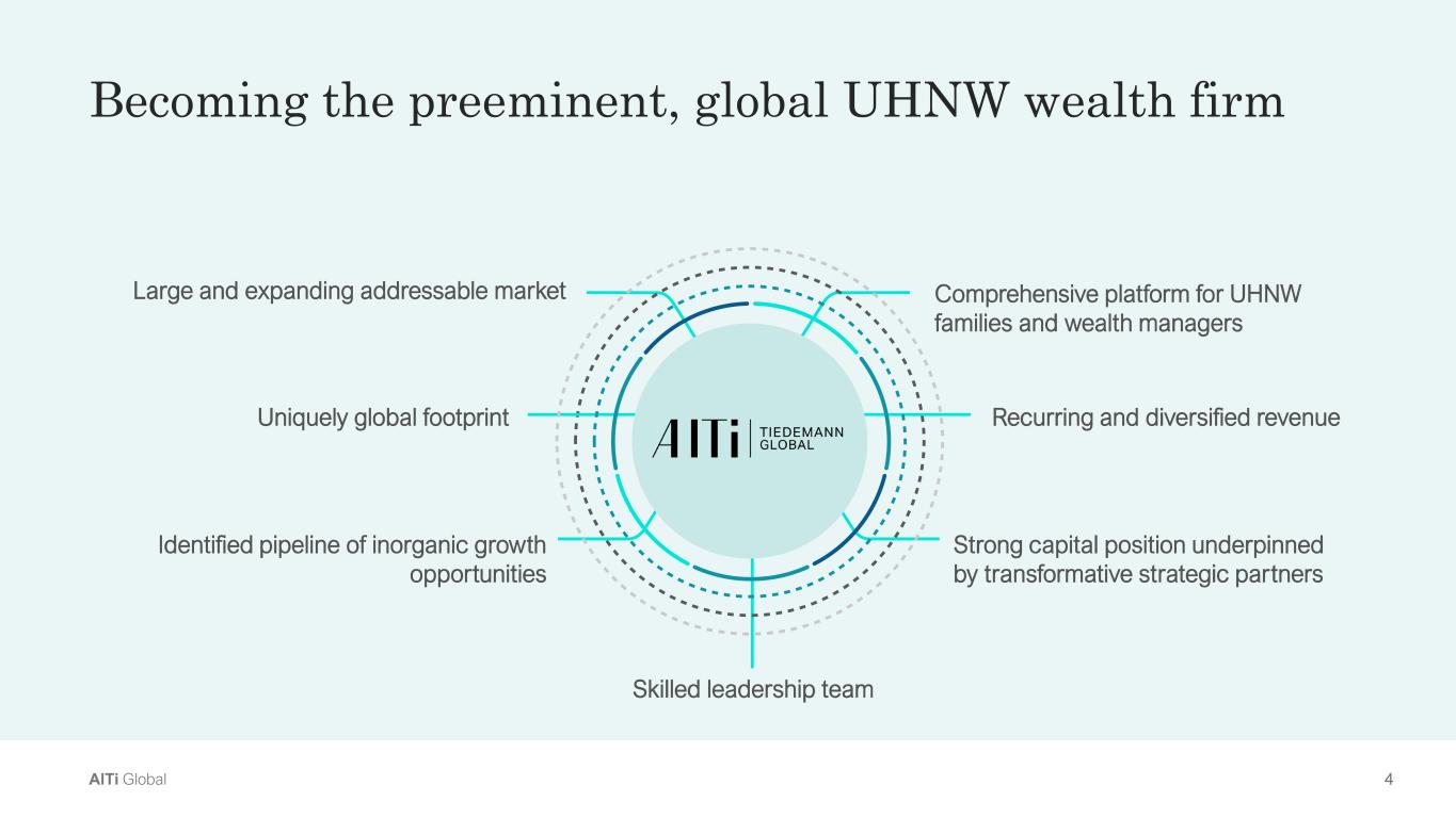3AlTi Global at-a-glance U.S. vs. Non-U.S. AUM/AUA for top 25 wealth management clients 64% vs. 36%$76B Consolidated AUM/AUA 5 Acquisitions and integrations completed, or in process, globally since 2023 Client retention rate since 2020 96% 19 Offices across the globe in major financial centers Global strategic partnerships provide growth capital, access and relationships Years operating history focused on UHNW 20+ Note: Information as of December 31, 2024, unless otherwise noted Committed to impact strategies $5B 9 Years of average tenure for Wealth Management advisors 96% Recurring revenues