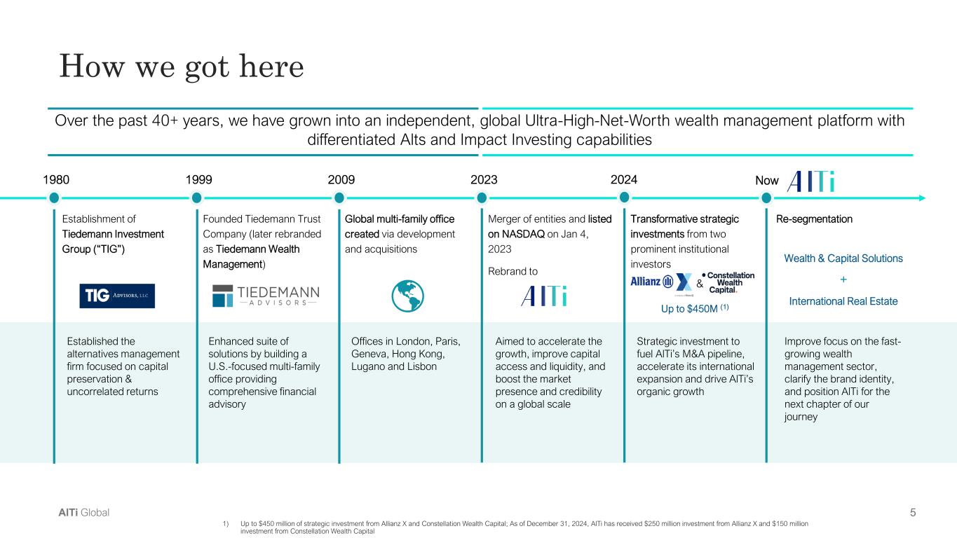 4AlTi Global Comprehensive platform for UHNW families and wealth managers Large and expanding addressable market Uniquely global footprint Recurring and diversified revenue Strong capital position underpinned by transformative strategic partners Identified pipeline of inorganic growth opportunities Skilled leadership team Becoming the preeminent, global UHNW wealth firm