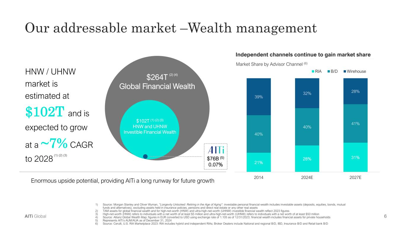 5AlTi Global Transformative strategic investments from two prominent institutional investors 1980 1999 2009 2023 2024 Establishment of Tiedemann Investment Group (“TIG”) Founded Tiedemann Trust Company (later rebranded as Tiedemann Wealth Management) Merger of entities and listed on NASDAQ on Jan 4, 2023 Rebrand to & Global multi-family office created via development and acquisitions Established the alternatives management firm focused on capital preservation & uncorrelated returns Enhanced suite of solutions by building a U.S.-focused multi-family office providing comprehensive financial advisory Offices in London, Paris, Geneva, Hong Kong, Lugano and Lisbon Now Re-segmentation Strategic investment to fuel AlTi’s M&A pipeline, accelerate its international expansion and drive AlTi’s organic growth Aimed to accelerate the growth, improve capital access and liquidity, and boost the market presence and credibility on a global scale Improve focus on the fast- growing wealth management sector, clarify the brand identity, and position AlTi for the next chapter of our journey How we got here Over the past 40+ years, we have grown into an independent, global Ultra-High-Net-Worth wealth management platform with differentiated Alts and Impact Investing capabilities + Wealth & Capital Solutions International Real Estate Up to $450M (1) 1) Up to $450 million of strategic investment from Allianz X and Constellation Wealth Capital; As of December 31, 2024, AlTi has received $250 million investment from Allianz X and $150 million investment from Constellation Wealth Capital