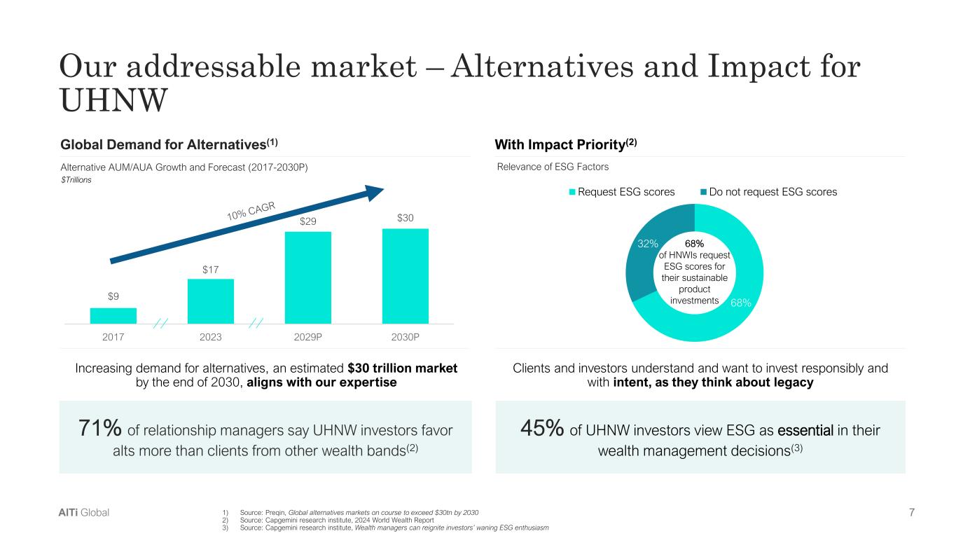 6AlTi Global Our addressable market –Wealth management Market Share by Advisor Channel (6) HNW / UHNW market is estimated at $102T and is expected to grow at a ~7% CAGR to 2028 Enormous upside potential, providing AlTi a long runway for future growth $76B (5) 0.07% 1) Source: Morgan Stanley and Oliver Wyman, “Longevity Unlocked: Retiring in the Age of Aging”: investable personal financial wealth includes investable assets (deposits, equities, bonds, mutual funds and alternatives), excluding assets held in insurance policies, pensions and direct real estate or any other real assets 2) TAM assets for global financial wealth and for high-net-worth (HNW) and ultra-high-net-worth (UHNW) investible financial wealth reflect 2023 figures 3) High-net-worth (HNW) refers to individuals with a net worth of at least $5 million and ultra-high-net-worth (UHNW) refers to individuals with a net worth of at least $50 million 4) Source: Allianz Global Wealth Map; figures in EUR converted to USD using exchange rate of 1.105 as of 12/31/2023; financial wealth includes financial assets for private households 5) Represents AlTi’s AUM/AUA as of December 31, 2024 6) Source: Cerulli, U.S. RIA Marketplace 2023: RIA includes hybrid and independent RIAs; Broker Dealers include National and regional B/D, IBD, Insurance B/D and Retail bank B/D $264T Global Financial Wealth $102T (1) (2) (3) HNW and UHNW Investible Financial Wealth (2) (4) Independent channels continue to gain market share 21% 28% 31% 40% 40% 41% 39% 32% 28% 2014 2024E 2027E RIA B/D Wirehouse (1) (2) (3)