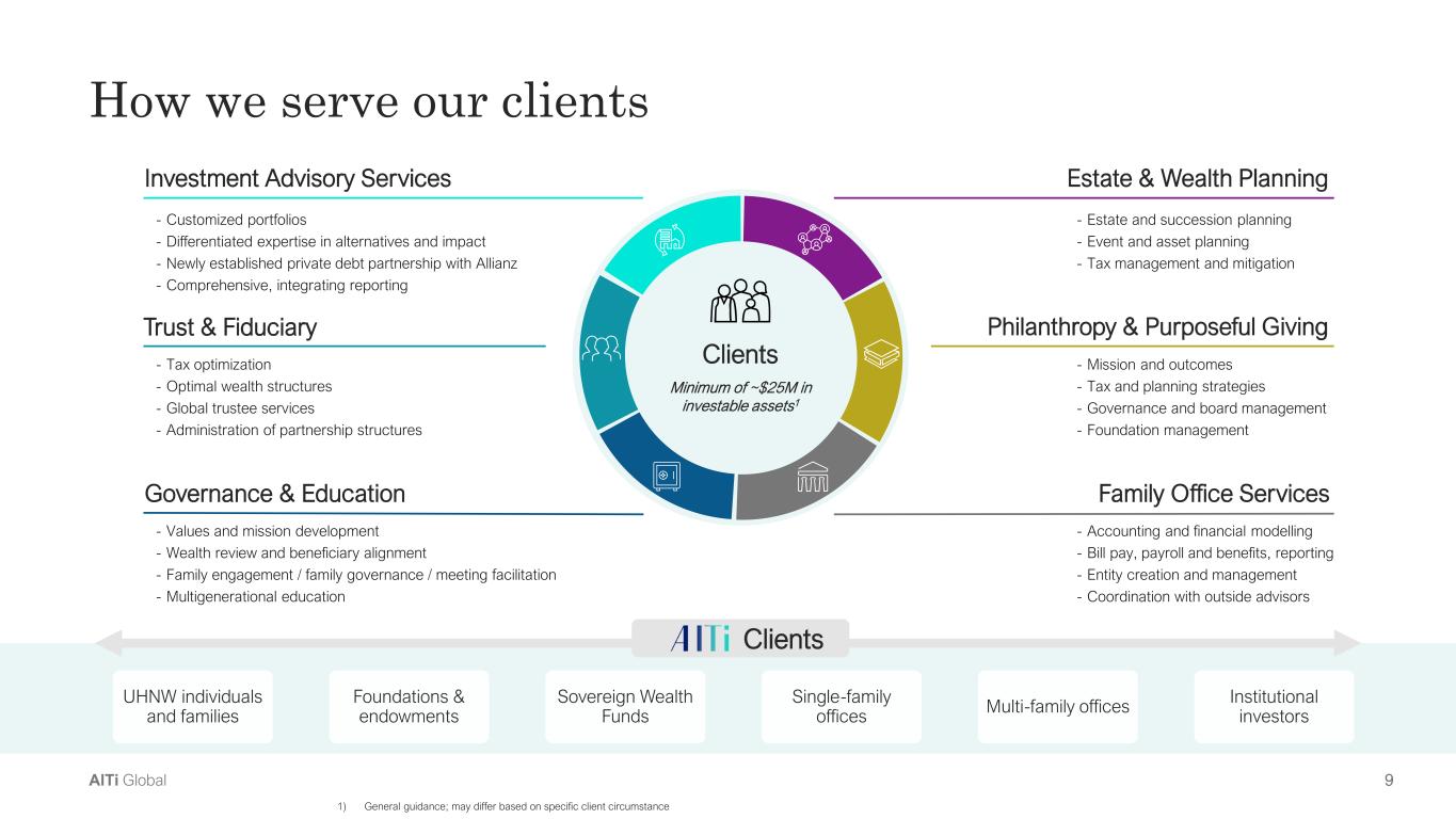 9AlTi Global - Tax optimization - Optimal wealth structures - Global trustee services - Administration of partnership structures How we serve our clients 1) General guidance; may differ based on specific client circumstance Trust & Fiduciary Family Office Services Philanthropy & Purposeful Giving Governance & Education Investment Advisory Services Estate & Wealth Planning - Customized portfolios - Differentiated expertise in alternatives and impact - Newly established private debt partnership with Allianz - Comprehensive, integrating reporting - Values and mission development - Wealth review and beneficiary alignment - Family engagement / family governance / meeting facilitation - Multigenerational education - Estate and succession planning - Event and asset planning - Tax management and mitigation - Mission and outcomes - Tax and planning strategies - Governance and board management - Foundation management - Accounting and financial modelling - Bill pay, payroll and benefits, reporting - Entity creation and management - Coordination with outside advisors Clients Minimum of ~$25M in investable assets1 UHNW individuals and families Foundations & endowments Sovereign Wealth Funds Single-family offices Multi-family offices Institutional investors Clients
