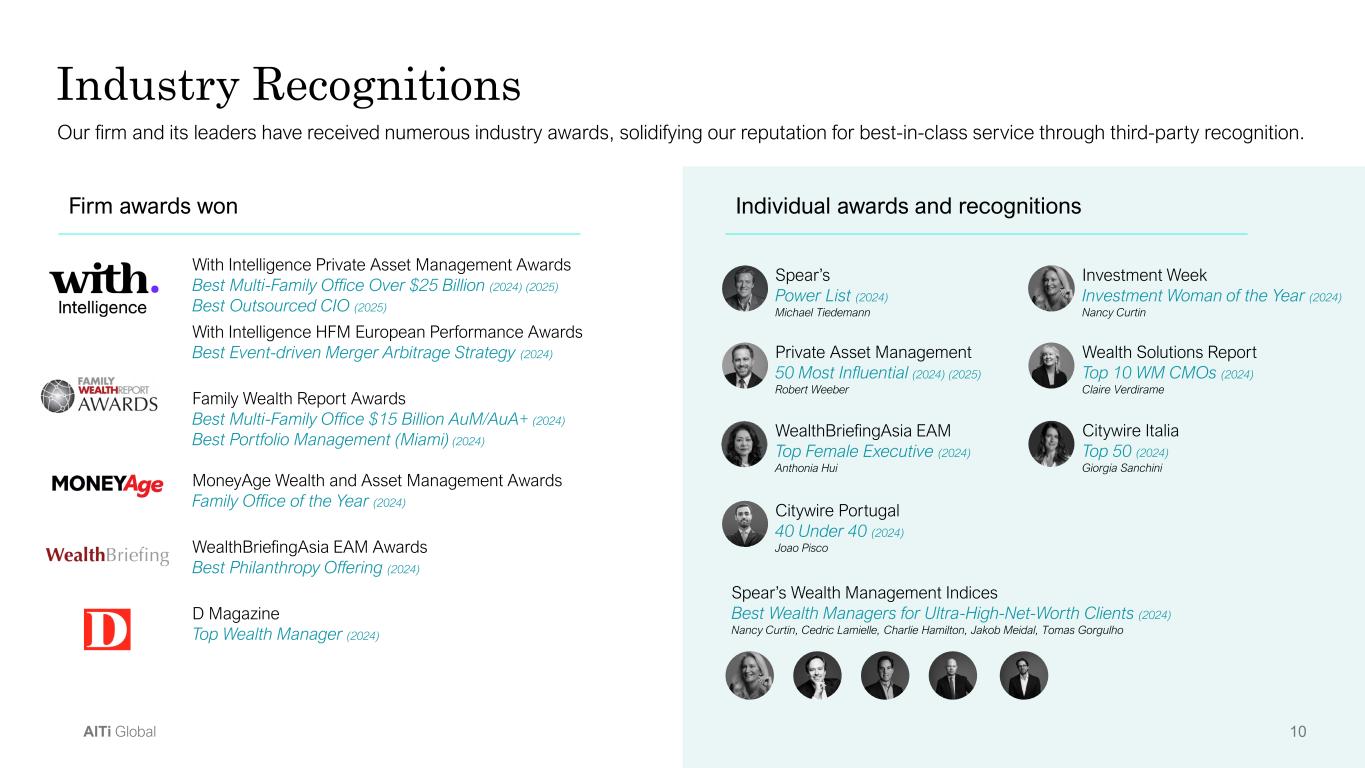 10AlTi Global Our firm and its leaders have received numerous industry awards, solidifying our reputation for best-in-class service through third-party recognition. Firm awards won With Intelligence Private Asset Management Awards Best Multi-Family Office Over $25 Billion (2024) (2025) Best Outsourced CIO (2025) With Intelligence HFM European Performance Awards Best Event-driven Merger Arbitrage Strategy (2024) Family Wealth Report Awards Best Multi-Family Office $15 Billion AuM/AuA+ (2024) Best Portfolio Management (Miami) (2024) MoneyAge Wealth and Asset Management Awards Family Office of the Year (2024) WealthBriefingAsia EAM Awards Best Philanthropy Offering (2024) D Magazine Top Wealth Manager (2024) Individual awards and recognitions Spear’s Power List (2024) Michael Tiedemann Industry Recognitions Citywire Portugal 40 Under 40 (2024) Joao Pisco Wealth Solutions Report Top 10 WM CMOs (2024) Claire Verdirame WealthBriefingAsia EAM Top Female Executive (2024) Anthonia Hui Citywire Italia Top 50 (2024) Giorgia Sanchini Spear’s Wealth Management Indices Best Wealth Managers for Ultra-High-Net-Worth Clients (2024) Nancy Curtin, Cedric Lamielle, Charlie Hamilton, Jakob Meidal, Tomas Gorgulho Investment Week Investment Woman of the Year (2024) Nancy Curtin Private Asset Management 50 Most Influential (2024) (2025) Robert Weeber