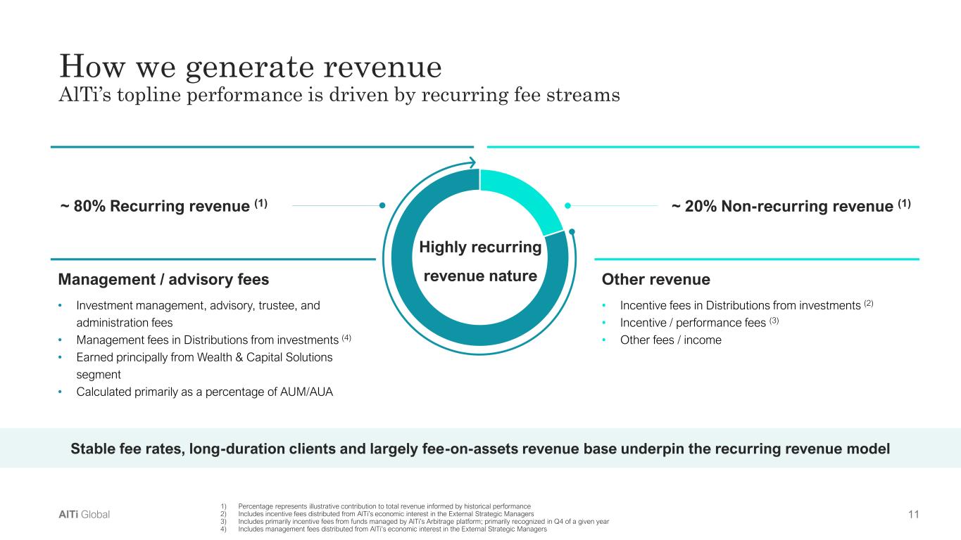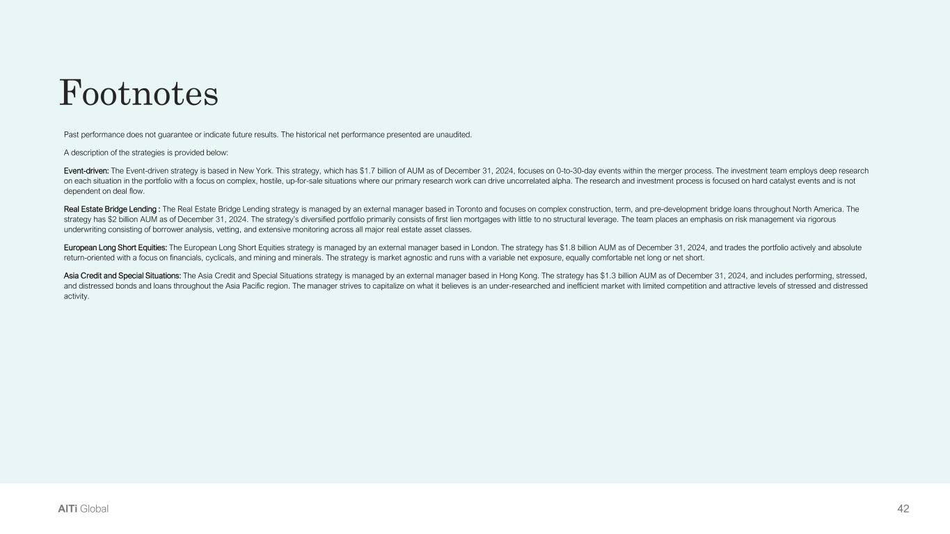 42AlTi Global Footnotes Past performance does not guarantee or indicate future results. The historical net performance presented are unaudited. A description of the strategies is provided below: Event-driven: The Event-driven strategy is based in New York. This strategy, which has $1.7 billion of AUM as of December 31, 2024, focuses on 0-to-30-day events within the merger process. The investment team employs deep research on each situation in the portfolio with a focus on complex, hostile, up-for-sale situations where our primary research work can drive uncorrelated alpha. The research and investment process is focused on hard catalyst events and is not dependent on deal flow. Real Estate Bridge Lending : The Real Estate Bridge Lending strategy is managed by an external manager based in Toronto and focuses on complex construction, term, and pre-development bridge loans throughout North America. The strategy has $2 billion AUM as of December 31, 2024. The strategy’s diversified portfolio primarily consists of first lien mortgages with little to no structural leverage. The team places an emphasis on risk management via rigorous underwriting consisting of borrower analysis, vetting, and extensive monitoring across all major real estate asset classes. European Long Short Equities: The European Long Short Equities strategy is managed by an external manager based in London. The strategy has $1.8 billion AUM as of December 31, 2024, and trades the portfolio actively and absolute return-oriented with a focus on financials, cyclicals, and mining and minerals. The strategy is market agnostic and runs with a variable net exposure, equally comfortable net long or net short. Asia Credit and Special Situations: The Asia Credit and Special Situations strategy is managed by an external manager based in Hong Kong. The strategy has $1.3 billion AUM as of December 31, 2024, and includes performing, stressed, and distressed bonds and loans throughout the Asia Pacific region. The manager strives to capitalize on what it believes is an under-researched and inefficient market with limited competition and attractive levels of stressed and distressed activity.