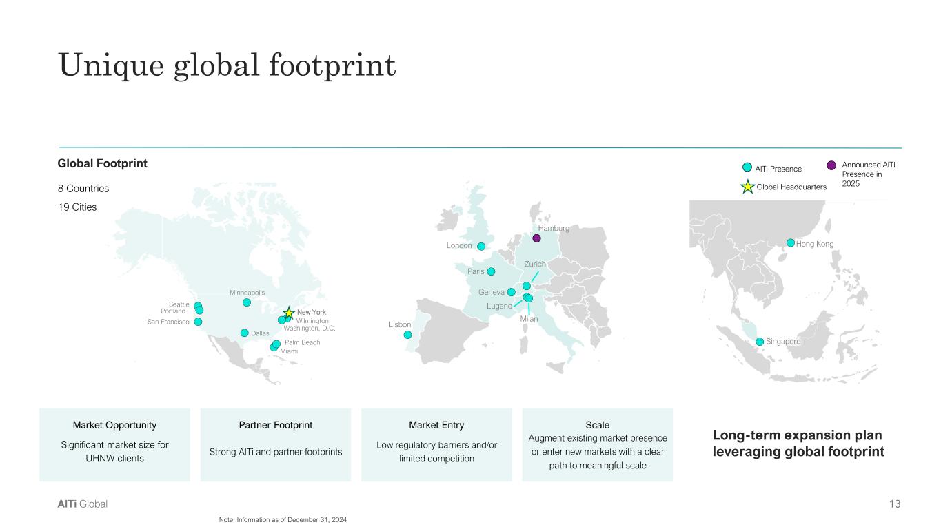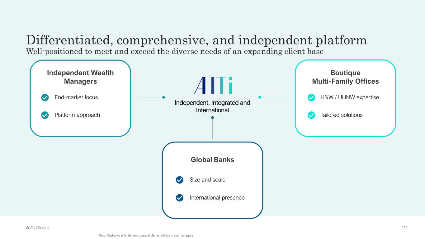 12AlTi Global Note: Illustrative only; denotes general characteristics in each category Differentiated, comprehensive, and independent platform Well-positioned to meet and exceed the diverse needs of an expanding client base Boutique Multi-Family Offices Independent Wealth Managers End-market focus Platform approach HNW / UHNW expertise Tailored solutions Global Banks Size and scale International presence Independent, Integrated and International