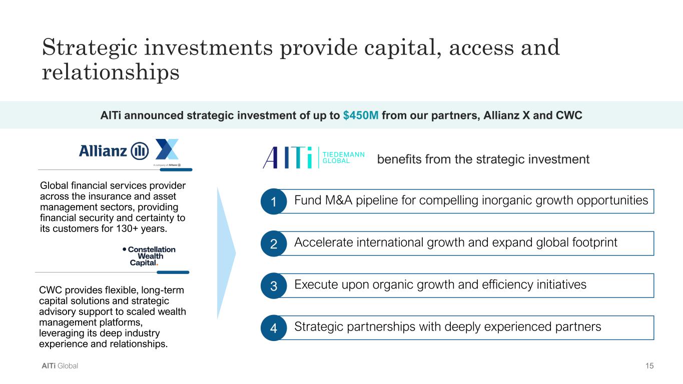 14AlTi Global AlTi is at an inflection point Strategic investment from Allianz X and CWC Partnerships and growth capital to accelerate AlTi’s growth story Skilled team AlTi has the management, governance, and employee talent to win Complementary expertise Interplay between Wealth, Alts and Impact is synergistic and underscores our unique story Operational efficiency AlTi is optimizing our operations and expense base to maximize efficiency Experience as a public company Two years after listing, AlTi has evolved into a compelling story for public investors Tailwinds in UHNW Wealth Management AlTi’s core customer base is expected to grow substantially, benefitting our business