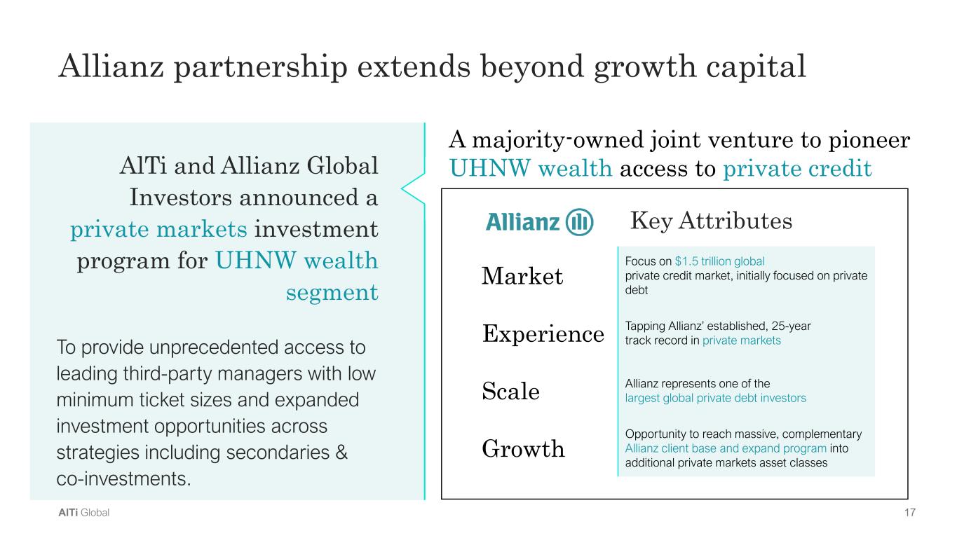16AlTi Global U.S. & International Markets $2B to $20B AUM per Target in UHNW Managers Profile • Proven low volatility, long-duration earnings • Bias towards management vs. performance/incentive fee income • Attractive top-line growth potential • Proven high and sustainable margins • Accretive to earnings Footprint/solutions • Enter new, complementary and strategic markets • Grow market share in existing markets • Enhance solution set Fit • Ease of integration • Cultural alignment • Long-term, financially committed and incentivised management teams Pipeline and criteria for future acquisitions Allianz and CWC’s investment is already bearing fruit Notable acquisitions completed or announced 1) See Form 8-K filed on April 1, 2024, and other Company filings with the SEC 2) See Form 8-K filed on July 1, 2024, and other Company filings with the SEC 3) See Form 8-K filed on March 6, 2025, and other Company filings with the SEC • Minneapolis-based UHNW wealth manager with ~$3B AUM • Expands operations to the Midwest region of the U.S., fortifying AlTi’s domestic footprint • Completed on July 1, 2024 (2) • New York-based independent advisory firm with ~$6B AUM • Enhances Outsourced Chief Investment Officer (OCIO) capabilities • Completed on April 3, 2024 (1) AlTi expects to use the and capital principally to fund accretive M&A • Hamburg-based UHNW wealth manager with ~$15B AUM/AUA • Expands European presence through entry into Germany, the third largest UHNW market in the world • Announced on March 6, 2025, expected to close in Q2 2025 (3)