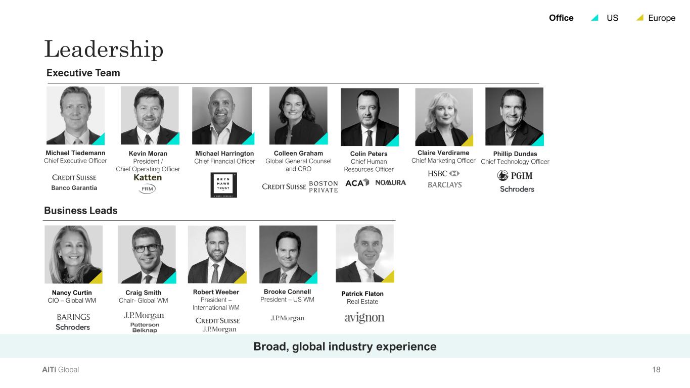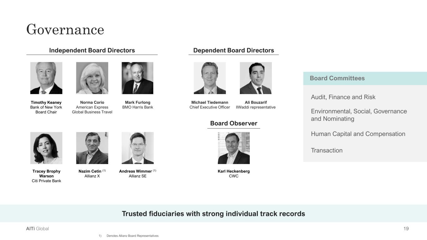 18AlTi Global Business Leads Broad, global industry experience Leadership Michael Tiedemann Chief Executive Officer Kevin Moran President / Chief Operating Officer Michael Harrington Chief Financial Officer Colleen Graham Global General Counsel and CRO Claire Verdirame Chief Marketing Officer Executive Team US Europe Nancy Curtin CIO – Global WM Brooke Connell President – US WM Craig Smith Chair- Global WM Robert Weeber President – International WM Patrick Flaton Real Estate Office Colin Peters Chief Human Resources Officer Phillip Dundas Chief Technology Officer