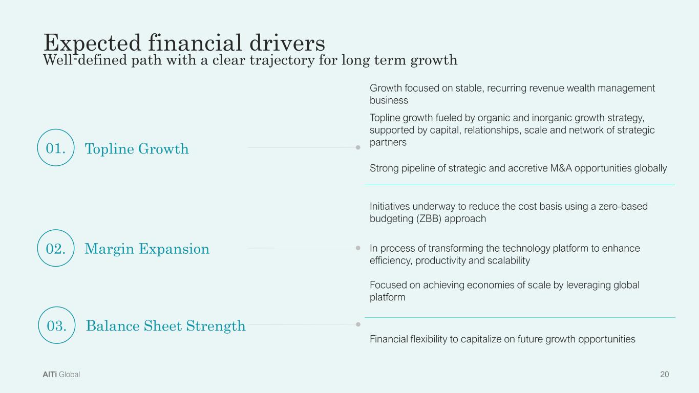 20AlTi Global Growth focused on stable, recurring revenue wealth management business Topline growth fueled by organic and inorganic growth strategy, supported by capital, relationships, scale and network of strategic partners Strong pipeline of strategic and accretive M&A opportunities globally Initiatives underway to reduce the cost basis using a zero-based budgeting (ZBB) approach In process of transforming the technology platform to enhance efficiency, productivity and scalability Focused on achieving economies of scale by leveraging global platform Financial flexibility to capitalize on future growth opportunities 01. Topline Growth 02. Margin Expansion 03. Balance Sheet Strength Expected financial drivers Well-defined path with a clear trajectory for long term growth