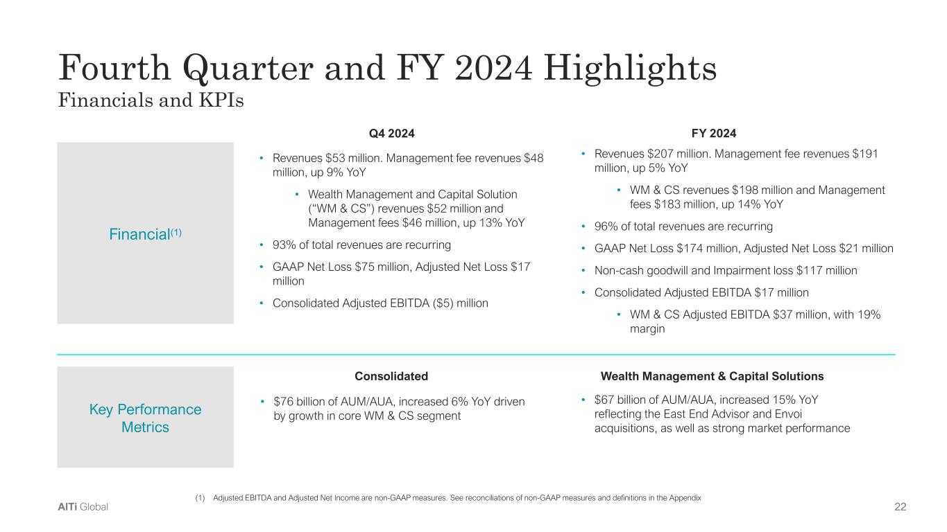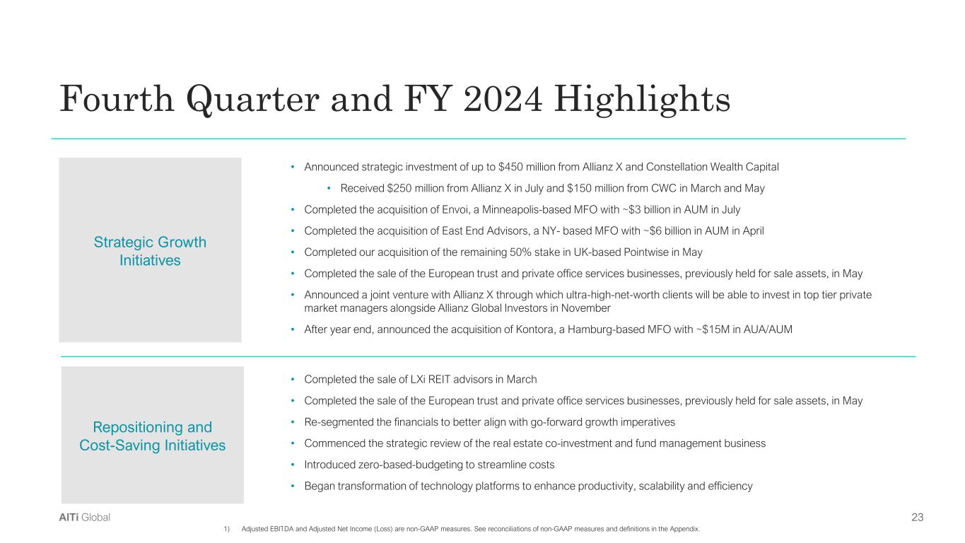 23AlTi Global Fourth Quarter and FY 2024 Highlights 1) Adjusted EBITDA and Adjusted Net Income (Loss) are non-GAAP measures. See reconciliations of non-GAAP measures and definitions in the Appendix. Strategic Growth Initiatives • Announced strategic investment of up to $450 million from Allianz X and Constellation Wealth Capital • Received $250 million from Allianz X in July and $150 million from CWC in March and May • Completed the acquisition of Envoi, a Minneapolis-based MFO with ~$3 billion in AUM in July • Completed the acquisition of East End Advisors, a NY- based MFO with ~$6 billion in AUM in April • Completed our acquisition of the remaining 50% stake in UK-based Pointwise in May • Completed the sale of the European trust and private office services businesses, previously held for sale assets, in May • Announced a joint venture with Allianz X through which ultra-high-net-worth clients will be able to invest in top tier private market managers alongside Allianz Global Investors in November • After year end, announced the acquisition of Kontora, a Hamburg-based MFO with ~$15M in AUA/AUM Repositioning and Cost-Saving Initiatives • Completed the sale of LXi REIT advisors in March • Completed the sale of the European trust and private office services businesses, previously held for sale assets, in May • Re-segmented the financials to better align with go-forward growth imperatives • Commenced the strategic review of the real estate co-investment and fund management business • Introduced zero-based-budgeting to streamline costs • Began transformation of technology platforms to enhance productivity, scalability and efficiency